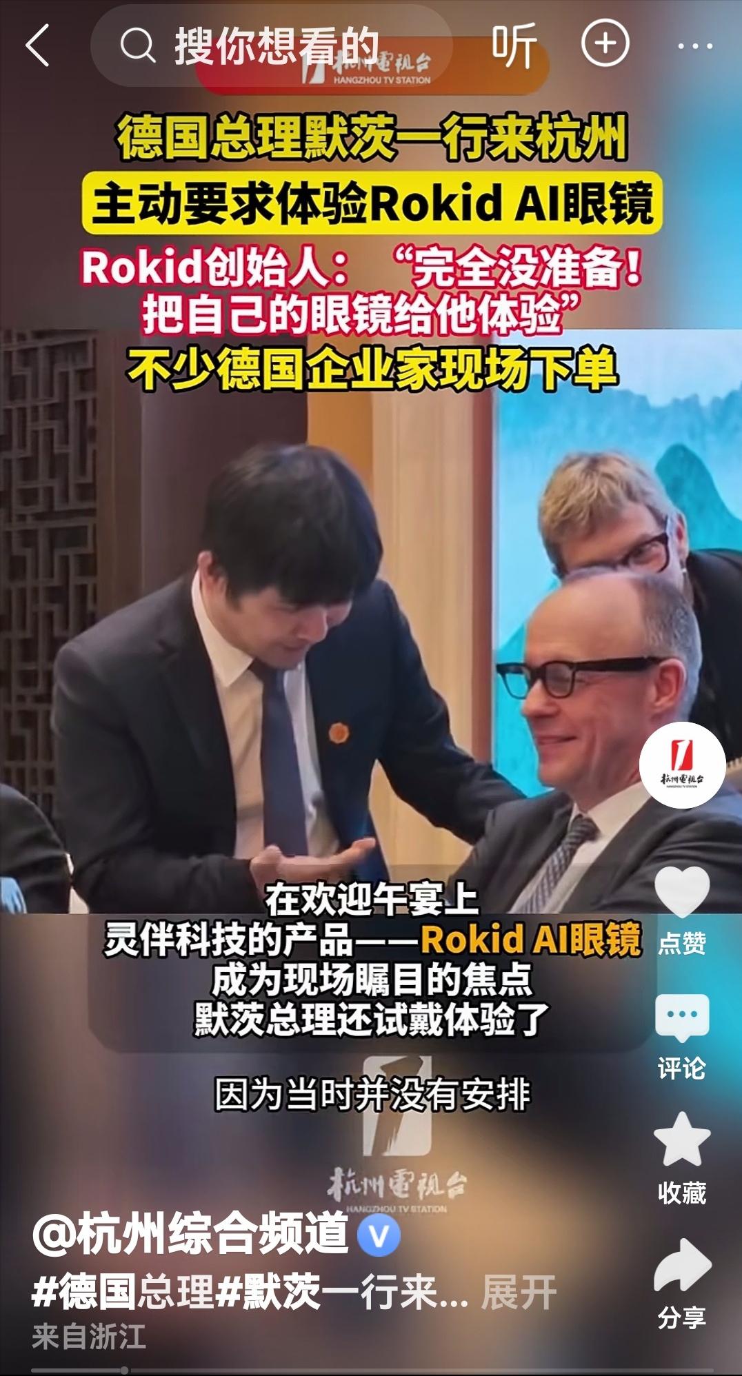 杭州"六小龙"之一!Rokid凭一副AI眼镜让德国总理现场"种草" 近日,德国总理默茨访华期间,在杭州主动要求体验Rokid AI眼镜,创始人祝铭明当场摘下自己的眼镜递上。这一"完全没准备"的即兴互动,让默茨玩了近10分钟,还现场向随行企业家推荐,七八人当场下单。 可能很多朋友还不了解Rokid到底是什么来头 作为杭州科创"六小龙"之一,2014年成立至今,一直深耕无人区,不搞花架子,只做硬核技术。 它不是简单组装产品,而是实现了全栈自研,从操作系统YodaOS到核心芯片"玄鸟",再到衍射光波导光学技术,全是自主可控, 默茨体验的这款眼镜,看着和普通眼镜没区别,重量仅49克,比很多墨镜还轻,却集成了20多项硬核功能, 最让默茨惊艳的就是实时翻译,中方说中文,他眼前直接浮现德文字幕,延迟不到300毫秒,精准又流畅,彻底解决跨语言沟通痛点, 也难怪他玩得爱不释手,当场就给德国企业家"带货"。 更值得说道的是,这次互动完全是即兴的,没有彩排,没有备用眼镜,祝铭明直接把自己戴的眼镜摘给默茨,这种自信源于产品的成熟可靠。 默茨体验后连用"准确""快速"评价,还主动向阿迪达斯CEO等随行人员推荐,这些德国企业家向来以严苛著称,能让他们当场下单,足以证明Rokid眼镜的实力,不是靠营销,是靠真刀真枪的技术征服了最挑剔的用户。 要知道,德国是Rokid在欧洲的第一大市场,产品早就占据欧洲销量半壁江山,还和奥迪、大众、西门子等巨头深度合作, 这次默茨亲自体验,相当于给中国科技做了一次全球级别的权威背书。 以前我们离不开手机,看信息、导航、翻译都要低头操作,现在戴上这副眼镜,眼前就能直接显示虚拟信息, 导航不用看手机,翻译不用点软件,拍照、录音、支付动动嘴就能完成,甚至在工业场景能辅助工人精准操作, 医疗场景能投射手术方案,文博场景能当私人导游,真正实现了"虚实融合"。 这种技术不是概念,已经落地全球80多个国家,消费级产品出货超30万台,用户复购率高达35%,早就从实验室走进了现实生活。 对比国外同类产品,更能看出中国科技的进步,苹果、Meta的AR眼镜,要么重量超标,要么价格昂贵,动辄上万元,还存在诸多功能缺陷, 而Rokid不仅做到了轻量化、全功能,价格还不到国外产品的一半,真正做到了"好用又亲民"。 这背后是中国完整产业链的支撑,从光学镜片到芯片制造,从算法研发到量产组装,全链条自主可控,成本比国外低40%,这是任何国家都无法比拟的优势。 就像杭州科创的"竹林效应",宇树科技、强脑科技等企业抱团发展,根系交织、共生共荣,形成了其他地区无法复制的创新生态。 放眼全球,这样的中国科技企业不在少数,雷鸟创新凭借轻量化技术拿下全球39%的AR眼镜市场份额,XREAL攻克光波导核心技术,华为、小米纷纷布局AI眼镜,中国已经成为全球AR+AI领域的领跑者。 以前我们总觉得国外科技更先进,高端产品都要靠进口,现在彻底反转, 德国总理主动体验中国科技产品,德国企业家争相下单,这就是中国科技实力的最好证明,也是中国制造向中国创造转变的真实缩影。 以前我们追着国外科技跑,现在国外主动来学习、来体验、来购买,这就是中国科技的底气。 未来,会有更多像Rokid一样的中国企业崛起,在更多科技领域领跑全球,用硬实力赢得世界尊重,这才是中国科技发展的真正底气,也是民族复兴的坚实根基。