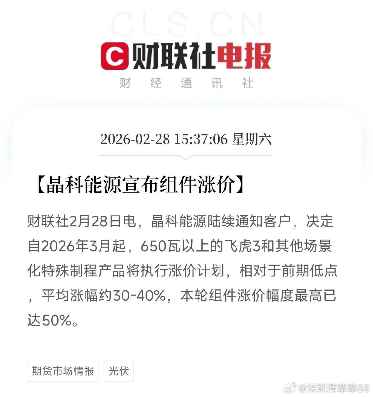 财联社15:37消息,晶科能源陆续通知客户,决定自2026年3月起,650瓦以上的飞虎3和其他场景化特殊制程产品,将执行涨价计划,相对于前期低点,平均涨幅约30-40%,本轮组件涨价幅度最高已达50%!
