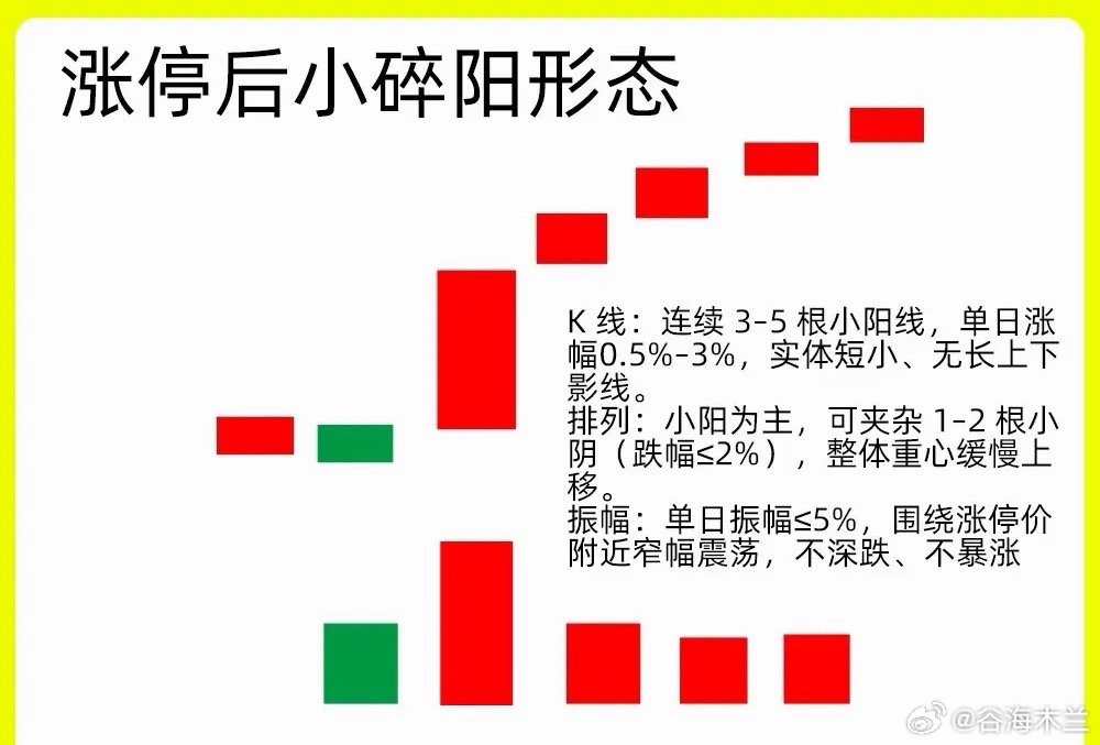 注意了!大部分的个股出现首板涨停以后,那大概率就是出现盘整,次日股价高开低走,进行强势洗盘,洗盘周期往往会有几个交易日,但是也有一种形态,虽然也是整理,可以说他是首板涨停里最为强势的一种。那就是涨停后小碎阳形态我们都知道个股出现首板涨停,这个阳柱的三个部分都是比较关键位置,涨停的收盘价、涨停板的2分之一处和涨停板的最低价,市场是否强势就可以看这个K线一、股价在低位出现一个首板涨停,最好此时收盘价突破了前期的重要压力位,成交量同时出现放大,这种才是合格的突破板,我之前把涨停板分类的六种类型二、次日股价开始调整,连续的三到五天里,都出现小阳线,偶尔有小阴线,每天涨跌幅都0.5%到1%左右,但是有一个细节,股价的重心在抬高,底部上升。三、均线系统,不管股价是否在洗盘,那此时的均线都应该是多头趋势,在整个洗盘过程里,股价都有跌破五日均线,四、涨停板当天成交量放大,次日股价开始盘整,成交量出现逐步缩量的走势,说明抛压并不大这就首板形态里,最为强势的洗盘,股价都没有跌破涨停板的最高价。希望对大家有启发,也是最为基础的内容,一定吃透。我们下期内容再见
