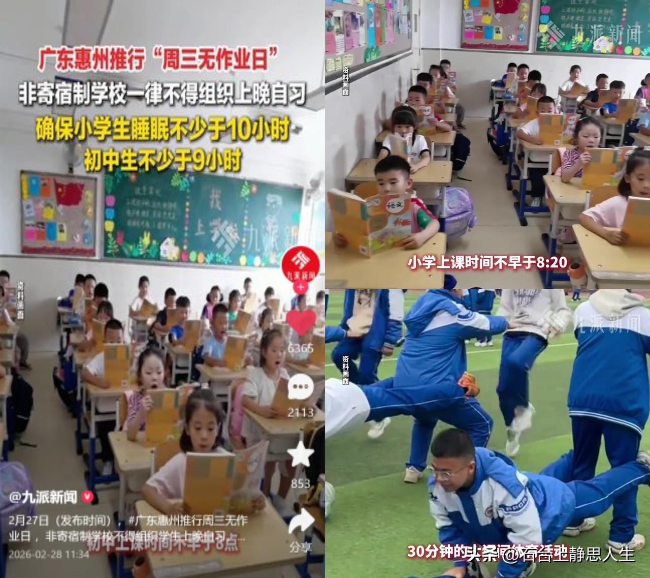 惠州推周三无作业,大家却笑不出来 惠州市教育局刚发新规:周三不许布置书面作业,非寄宿制学校禁上晚自习,硬卡睡眠时长。 刚发布一天,不少家长说学校没通知,大家都在讨论,消息直接传开了。 有人直接说出真相:这怕不是抖音里的惠州才有的政策? 谁不知道潜规则啊,周三没作业,周四不得把作业翻倍堆过来? 学校和老师为啥抵触?还不是怕成绩下滑担责任?说不定转头就把周三的作业,换个限时巩固任务的名头塞给周四。 说白了,这就是政策愿景和执行现实的拉扯。喊减负喊了多少年,每次都是好政策到了基层就变味:要么直接无视,要么换个方式加码,最后苦的还是娃和家长。 真要给孩子减负,光发通知没用,得把监督盯紧了。不然再美的规定,都是空架子。 你们那的减负政策,真落地了吗?