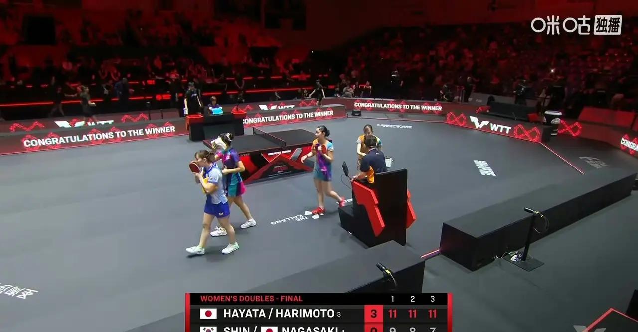 新加坡大满贯赛女双决赛,张本美和/早田希娜3一0申裕斌/长崎美柚获得冠军11一9,11一8,11一7。 张本美和单打2一4输王曼昱心态一点没受影响,双打可兴奋了单打是还诈伤故意打乱王曼昱的节奏,王曼昱太善良,赛后采访时王曼昱关心张本美和的伤,希望她快点好起来,说她带伤坚强的把比赛打完,观众都觉得她打不了决赛了,没想到一点没伤故意骗人的[捂脸][捂脸][捂脸]