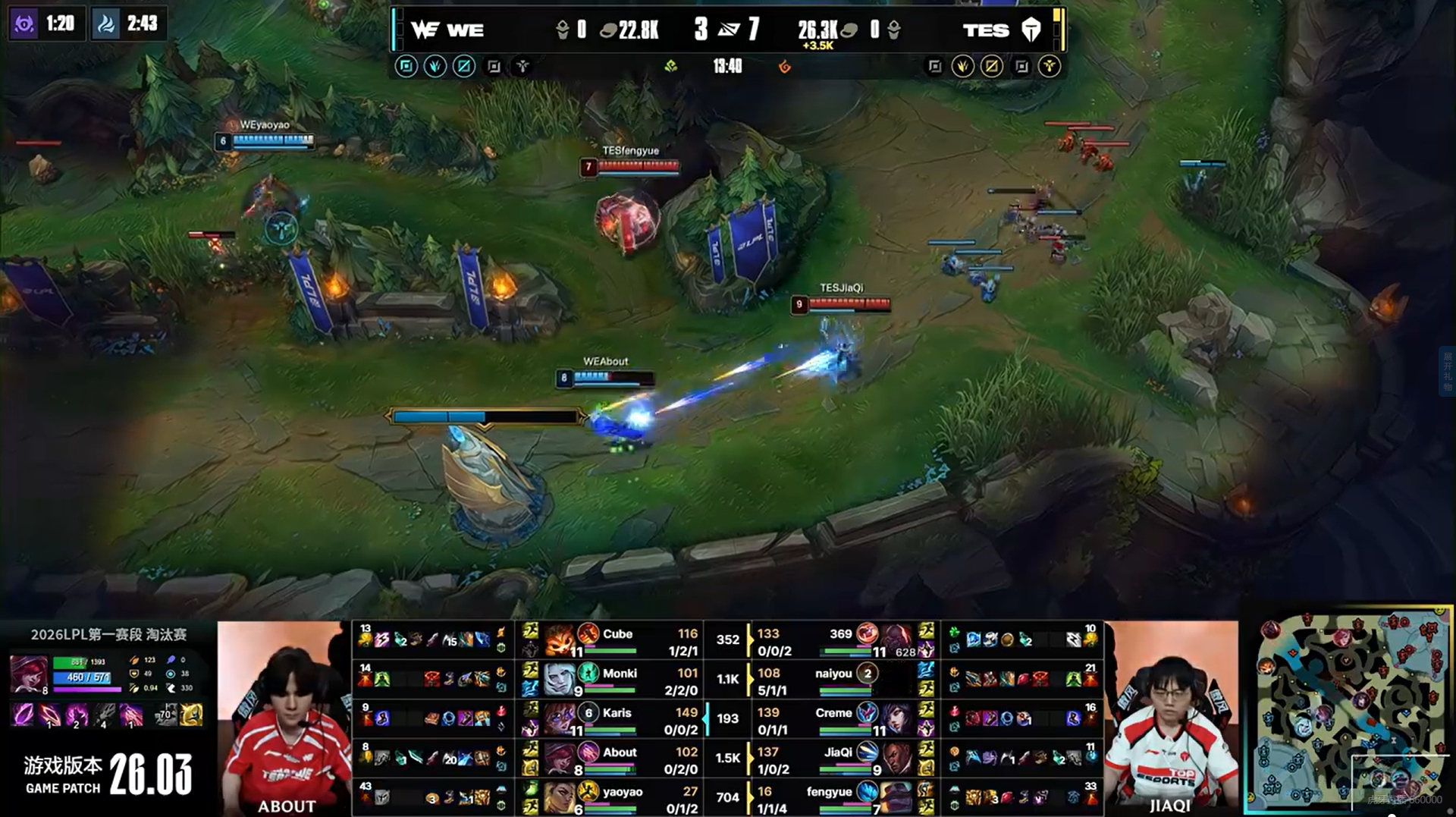 13分钟经济就落后35K,其中2K是WE自己送过去的。Monki佛耶戈一死WE团战接不了一点。跟赛前预测的一样,今天大概率是 3∶0tes对战we2026lpl第一赛段英雄联盟