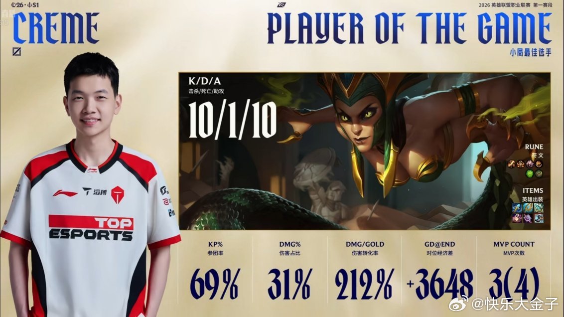 TES战胜WECreme撑起TES Creme职业生涯第一场蛇女,近期rank都没咋玩过,估计是训练赛试完还不错,就选出来在比赛里Carry了。