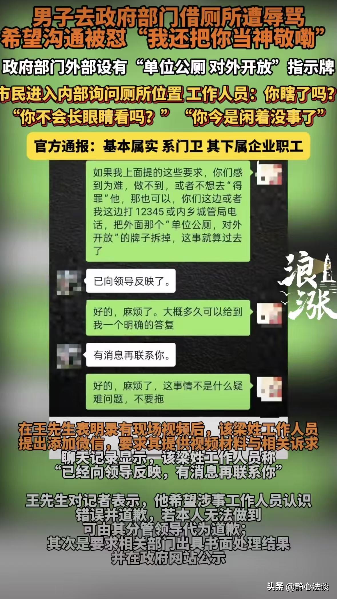 河南,男子内急,看到政 府门口有个牌子,写着对外开放,他急忙跑进去像门卫人员询问,厕所在哪里,谁知对方指着他大骂:你眼睛瞎吗?男子被无缘无故骂了一顿,气的不行,拿出手机要把门卫的嘴脸录进去,对方见状直接把男子撵出去,把门关了,边关边骂骂咧咧,事后男子咽不下这口气,将此事发到网上,要求对方道歉,或者领导代为道歉,后来相关部门就此事做出了通报以及回应! 2月14日早上,王先生买菜途中想上个厕所,人有三急,哪顾得上挑地方。 他抬头一瞅,前面没多远的农业农村局的门口,立着块牌子,写着:单位公厕,对外开放。 王先生快步往院里走,一进院子就碰到穿着制服的工作人员魏某从值班室走出来,他赶紧上前询问厕所在哪里。 谁知道魏某直接瞪了王先生一眼,指着他就说:你眼睛瞎吗?不会看指示牌! 这句话一出口,王先生当场就愣在原地,整个人都懵了,他甚至怀疑自己是不是听错了、明明门口写着对外开放。 自己客客气气问路,怎么就被骂眼睛瞎了?自己又不是故意捣乱,只是没戴眼镜看不清而已。 缓过神来的王先生,又尴尬又委屈,可实在急得不行,只能忍着心里的火气,再次小声确认厕所是不是在二楼。 他以为自己再问一遍,对方能好好说话,结果对方依旧没好脸色,语气更冲:那么大的字你看不到,还要我告诉你? 那一瞬间,王先生只觉得脸发烫,本来是正常求助,反倒像犯了错被当众训话。 他憋着一肚子委屈上完厕所,出来就想跟对方好好说道说道。 他不想吵架,也不想闹事,就想跟这名工作人员好好沟通一下。 跟对方说清楚自己是高度近视,当天没戴眼镜,不是故意不看指示牌,希望对方能明白,说话别这么难听。 可不管王先生怎么说,对方压根就不搭理他,连一句解释的机会都不给,全程冷着脸,一副爱答不理的样子。 这态度彻底让王先生寒了心,他没再继续纠缠,转身就往单位大门外走。 可让他更没想到的是,他前脚刚踏出大门,后脚就听见“哐当”一声。 那名工作人员直接用力关上了院子的推拉门,关门的声音特别大。 动作里全是不耐烦和嫌弃,仿佛王先生是什么不该进来的闲人,赶都赶不及。 王先生彻底火了,我按牌子进来的,正常问个路,凭什么受这窝囊气? 他立刻掏出手机,点开拍摄,想把魏某的态度拍下来讨个说法。 或许是看到王先生拿出手机拍摄,那名工作人员又把关上的推拉门打开。 王先生对着院子里大声喊,要求联系值班领导,他想跟领导反映一下情况,希望有人能出面协调,给自己一个说法。 可他喊了半天,始终没有任何领导出面,从头到尾,只有那名工作人员在跟他对峙。 视频里只有魏某看王先生拿手机录视频,一遍遍的问你要干啥?你解没解手?解了不就完了!你还想咋?让我把你敬起来? 就这一句话,把王先生最后一点想讲理的心思,彻底堵住了。 他突然明白,跟这种人讲道理,根本就是对牛弹琴。 对方从始至终,都没觉得自己做错了,更没觉得辱骂老百姓、摆臭脸是一件不对的事。 后来王先生没有大吵大闹,也没有做出任何过激的行为,他只是把自己拍的视频发到了网上。 他的要求特别简单,不要任何赔偿和补偿,他只想要一句真诚的道歉。 要么骂 人的这名工作人员亲自道歉,要么单位的领导出面,替他给自己道个歉,仅此而已。 让王先生没想到的是,视频发到网上之后,很快就引发了大量网友的关注和愤怒,大家纷纷为他打抱不平。 传播的速度越来越大之后,引起当地相关部门高度重视。 2月27日,相关部门针对王先生反映的问题展开全面调查。 经过细致的核实,初步调查结果显示,王先生反映的情况基本属实。 《民法典》第1024条规定:民事主体享有名誉权。任何组织或者个人不得以侮辱、诽谤等方式侵害他人的名誉权。 在公共场合辱骂他人、贬低人格,已经侵犯公民名誉权,受害人有权要求道歉、消除影响。 随后,也发布了正式的情况通报,给出了处理结果:对涉事人员魏某依规依纪做出严肃处理,并且要求魏某本人,向王先生公开道歉。 同时,要求农村局全面开展纪律专项整顿,从根本上杜绝类似的事情再次发生。 直到这一刻,王先生的委屈,才算有了一个结果,那句他心心念念的道歉,终于有着落了。 这件事看似已经圆满解决了,魏某被处理,王先生也拿到了道歉,单位开始整顿作风。 可很多人还是忍不住想问一句:如果王先生没有把视频发到网上,如果没有引发网友的关注,这件事是不是会悄无声息地过去了。 那他受的委屈,该找谁诉说?那句迟来的道歉,又要等到什么时候才能说出口? 其实往往就是这些鸡毛蒜皮的小事,最能检验初心,最能看出态度。 一个厕所,一句指路,一声道歉,看似微不足道,却连着普通人最真实的感受,连着政 府在群众心里的形象。 @静心法谈 学法辨是非,慬法不吃亏。