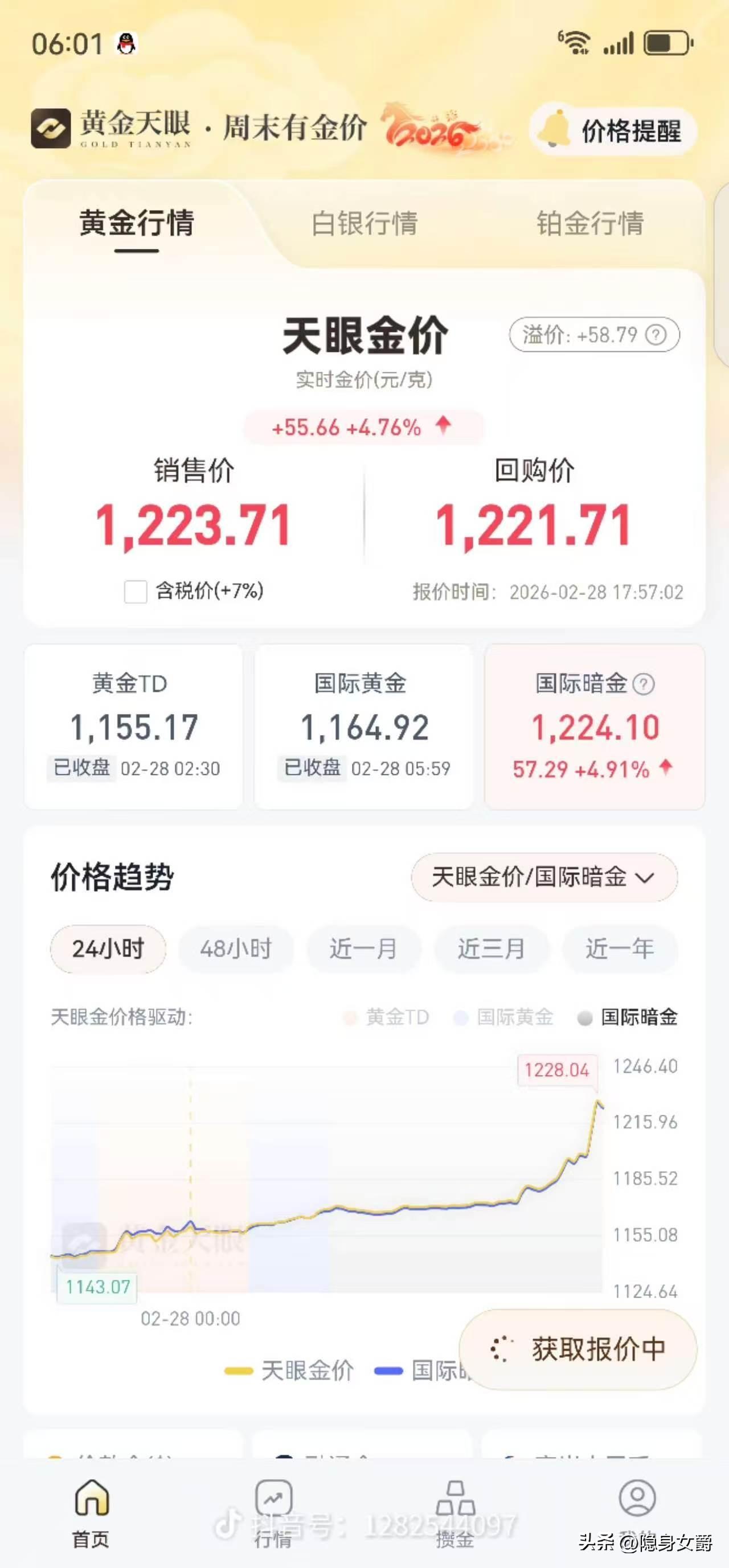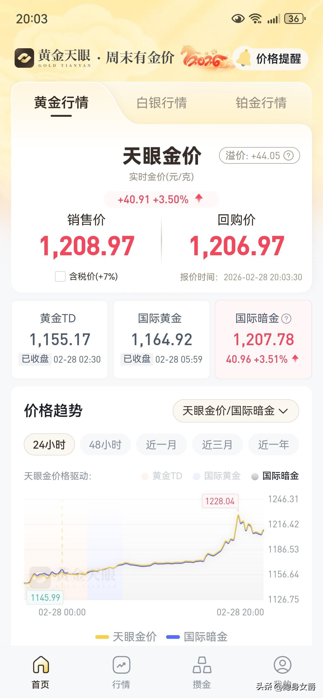 不会吧! 黄金就开始跌了? 6点时1223元,才两个小时,现在剩1208元了。 明天还有一天休盘呢,等等我们呀。 美伊不是还没分胜负么,打着呢还跌了15块每克。 周一快到来,老妇等不及了,我要卖黄金,我不管以后涨多少,坐过一次过山车,不好玩,我要卖掉去玩股票,这个漫长的周末,好讨厌。