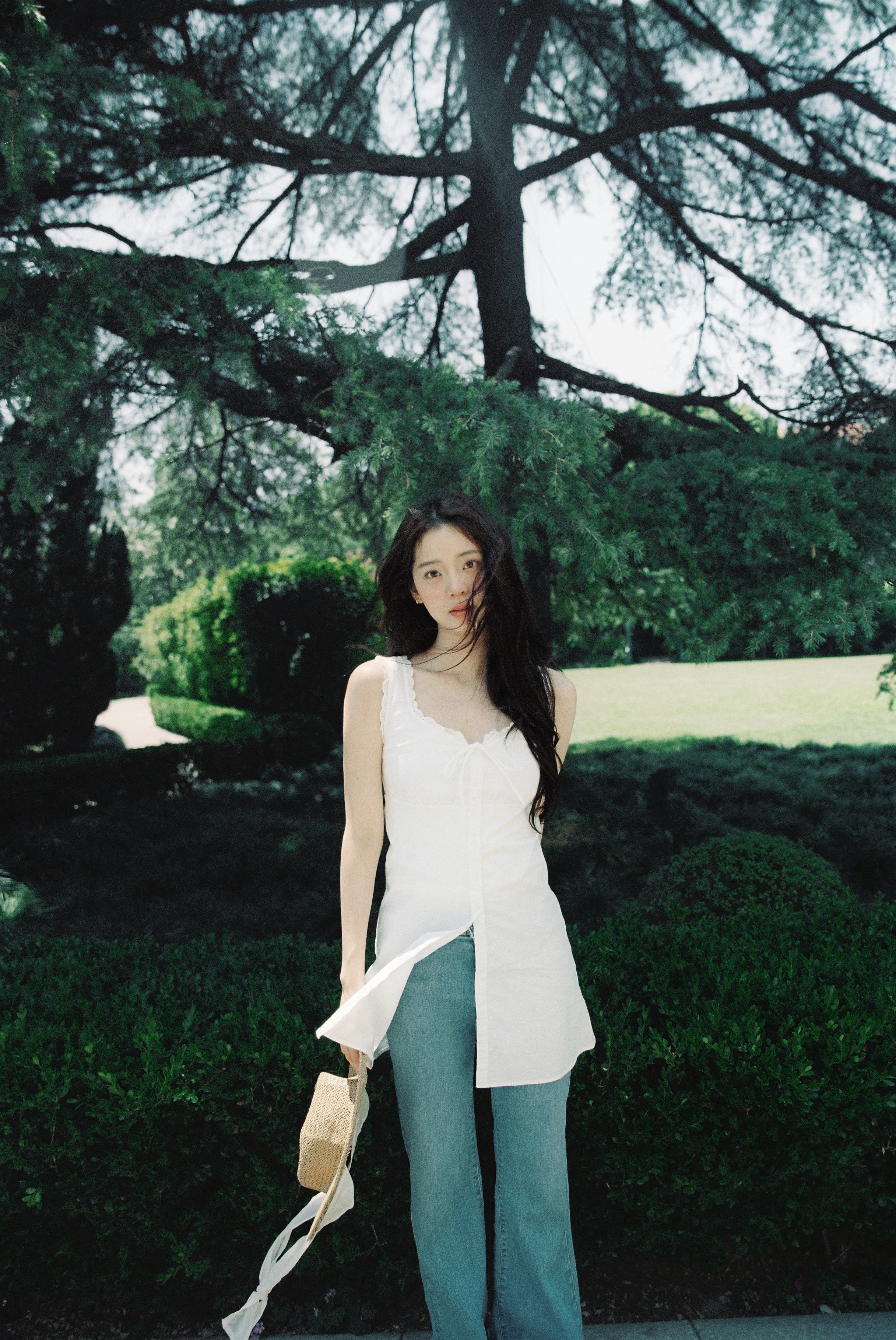 刘亦菲这条裤子挺养生,毕竟降温了肚脐眼必须护住啊