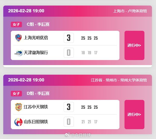 中国女排超级联赛A级季后赛总第16轮,C组和D组的上海和江苏分别在主场以3比0