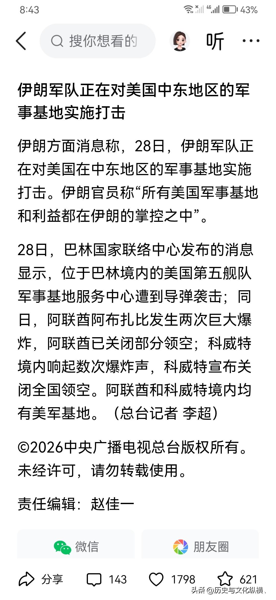 伊朗这次太给力了,美军科威特、巴林、阿联酋军事基地都遭到伊军打击,各该地都传来爆炸声。这波远火,是伊朗军民压抑多年的怒火倾泄。伊军表示:美军所有军事基地与军事利益都在打击范围内。 这当中应该包括以色列本土。 第一波次的双方互射互轰打重点,美军斩首,伊军炸基地。估计美军航母躲的远远的。伊军也在找目标,最好击沉林肯号或福特号。 再是对以色列繁华地段来个导弹洗地,麻鹤满天飞,把无人机群派出去。 美军犯了个严重错误,炸了伊朗一所小学,死亡人数已上升到50多人。 要命的是哈梅内伊还在指挥战斗。