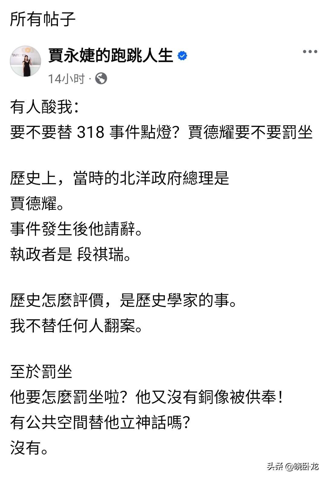 蔡正元还是太狠了,对付贾永婕(台北101董事长)和青鸟网军,直接在社交媒体发出一段贾永婕早期“辣眼睛”的跳舞视频。 台北101董事长贾永婕这回遇到硬茬了,由于她近日批老蒋,且有讨好民进党之嫌,这引起蔡正元的不满,蔡正元发长文谈到了贾永婕的曾祖父贾德润(曾任河南省淮阳县县长、绥远政务厅厅长)和贾永婕的曾祖伯父贾德耀(曾任北洋政府国务总理),尤其提到贾德耀当年被吴佩孚赶下台一事,蔡正元直接在文中用贾永婕批老蒋的口吻反讽:“我的曾祖伯父贾德耀一人得道,贾家一群鸡犬升天”。 贾永婕看到蔡正元的发文后进行了回应,说贾德耀请辞的,她不会替历史人物翻案,更不用“罚坐”贾德耀,因为他没有被立铜像供奉(这里又是在对比老蒋)。 后来很多的青鸟、绿营侧翼网军跑到蔡正元文章下面评论区骂蔡正元,蔡正元小编就和他们理论,蔡正义这暴脾气今天直接发了贾永婕一段早期跳舞视频进行回应,其实是一支十几年前15秒的冰箱广告视频,贾永婕在里面有跳舞,但是贾永婕疑似没穿衣服,辣眼睛部分打马赛克了。 不得不说蔡正元这种回应太狠了,评论区的青鸟们都不知道怎么出征了,只好说“贾永婕身材好皮肤好,你嫉妒了吗?”但是明眼人都看得出来那个时候贾永婕长相和现在不太一样,那时候看起来比较普通一点。