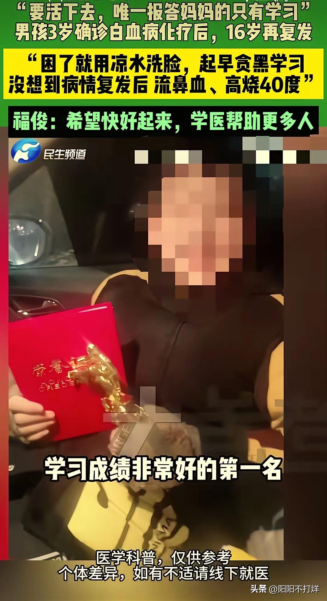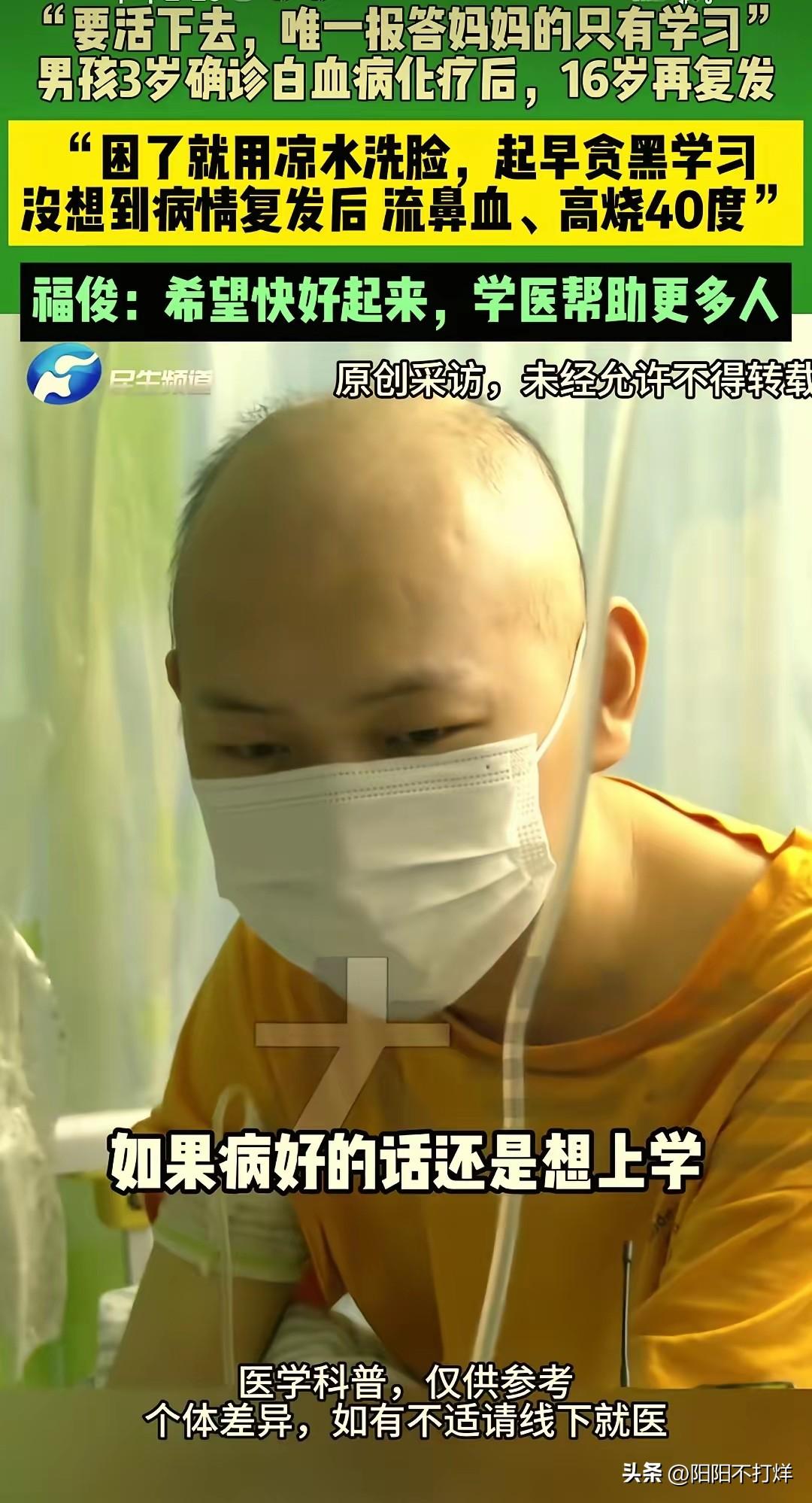“太坚强了!”河南郑州,一男生3岁时确诊白血病,16岁突然再次复发,母亲每天含泪照顾,哽咽说:“我怕会失去我的孩子。”没想到男生听了不但没哭,还一脸坚定的说:“我一定要活!病好了我要上学,能够报答我母亲的只有学习。” 这个叫福俊的男孩,3岁确诊急性淋巴细胞白血病,经过多年化疗后病情稳定。16岁本该备战中考,却突然出现流鼻血、高烧40度等症状,检查结果显示白血病复发。 福俊的母亲介绍,孩子从小就懂事。别的孩子玩耍时,他在病房看书;困了就用凉水洗脸提神,成绩一直是年级第一。他说,只有学习好,才能报答母亲多年的付出。 复发后,福俊再次住进医院。每天输液、化疗,身体虚弱,但他仍坚持看书。他说,等病好了要考医学院,将来帮助更多像他一样的病人。 这个家庭的困境引发关注。多年治疗已花光积蓄,复发后的治疗费用仍有巨大缺口。母亲四处筹钱,每天在医院照顾孩子,几乎没有休息时间。 有网友表示,福俊的坚强让人动容,但也心疼他过早承担了生活的重担。也有专业人士指出,儿童白血病复发后的治疗难度更大,需要社会更多支持。 目前,当地公益组织已介入,为福俊发起筹款项目。不少爱心人士伸出援手,捐款、留言鼓励,希望他能挺过难关。 我们在感动于福俊的励志故事时,更应看到背后的现实问题。重病儿童家庭的医疗负担、社会救助体系的完善,都需要持续关注和改进。 福俊的故事,不仅是一个少年与病魔抗争的缩影,更是对社会关怀的一次考验。我们希望,他能早日康复,实现自己的学医梦想;也希望,更多像他一样的孩子,能得到及时有效的帮助,不用把“活下去”和“学习”绑在一起。 你觉得,我们应该如何更好地帮助像福俊这样的重病儿童家庭?