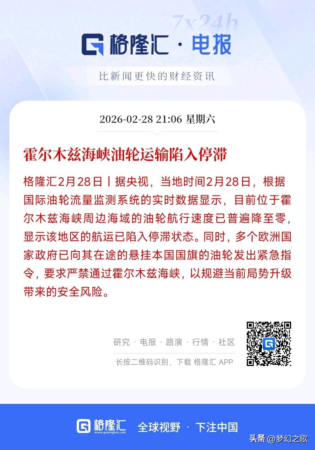 果然,霍尔木兹海峡还是出现了停滞的状态,俄罗斯笑开了花 最新消息,霍尔木兹海峡油轮陷入了停滞状态。 数据显示:霍尔木兹海峡日均原油运输量:1500–1800万桶/日(含成品油约2000万桶/日),占全球海运原油贸易的30%–35%。 也就是说目前每天运走全球近1/3的海运原油生意停滞、约1/5的全球石油供应出现了缺口。 不用想,这次原油的价格肯定要疯长了,中东的原油运不出来,那么页岩油和俄罗斯的石油就会成为承接新的供应链,即使在制裁,总不能停滞制造业,这次大俄算是白白捡了便宜。