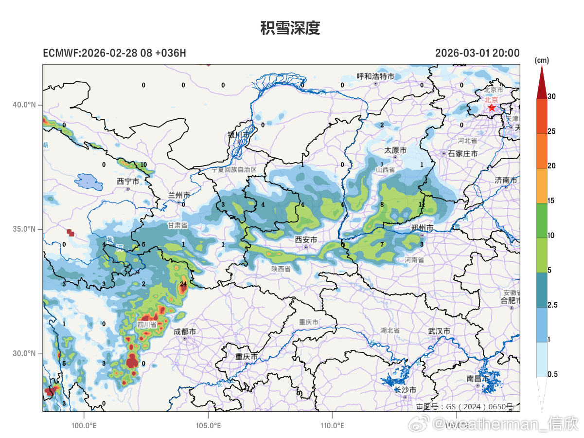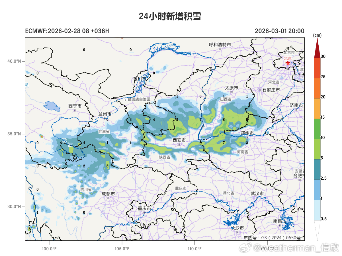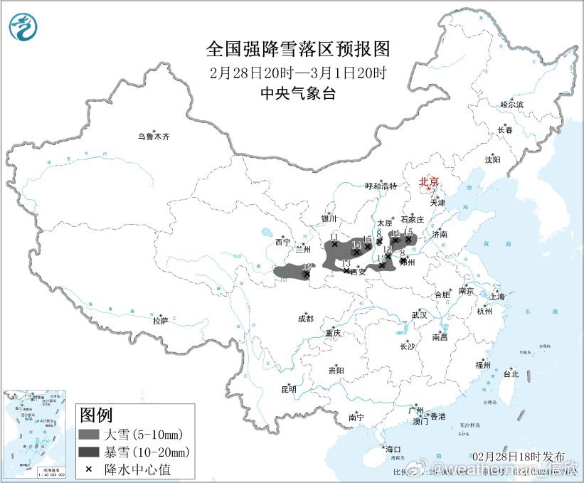 【暴雪预警】今晚中央气象台发布暴雪蓝色预警(图1):预计2月28日20时至3月1日20时,甘肃东南部、陕西中部、山西南部、河北西南部、河南北部和西部等地的部分地区有大雪,局地有暴雪(10~15毫米),上述地区新增积雪深度2~8厘米,局地可达10~15厘米(图2-3)。