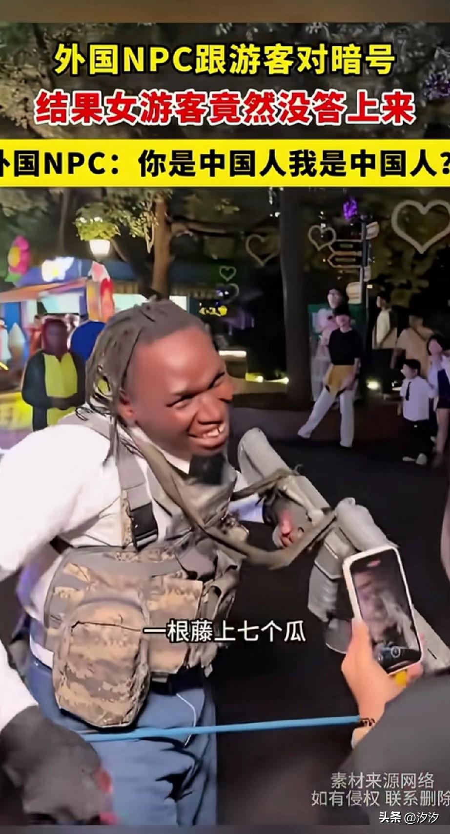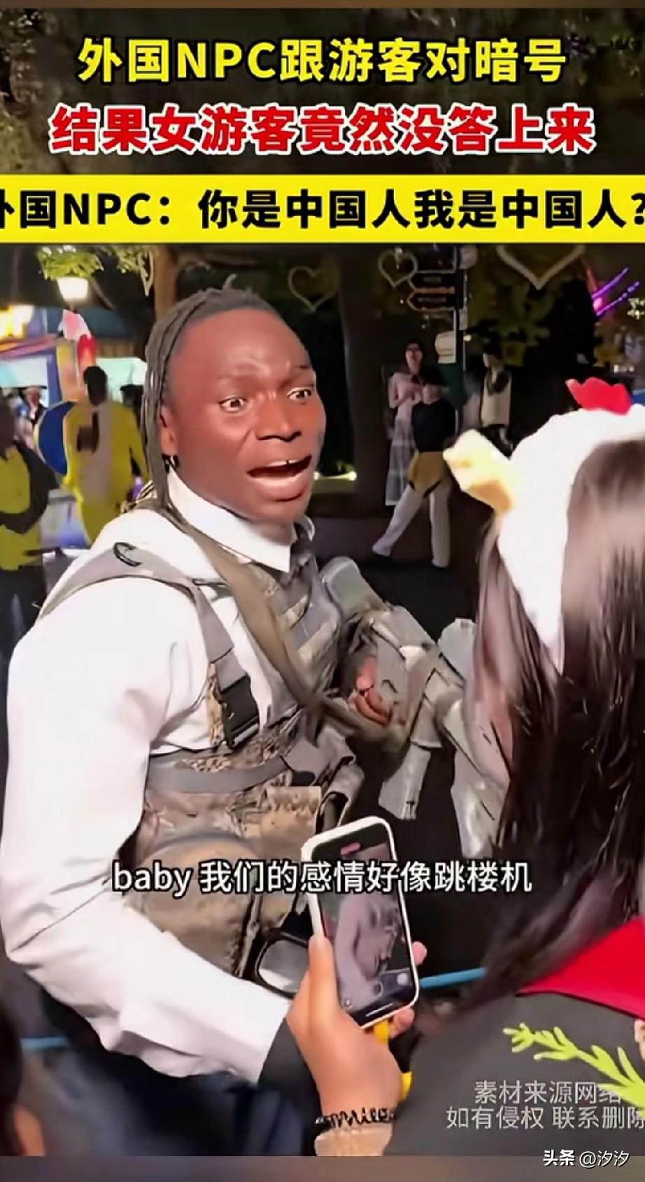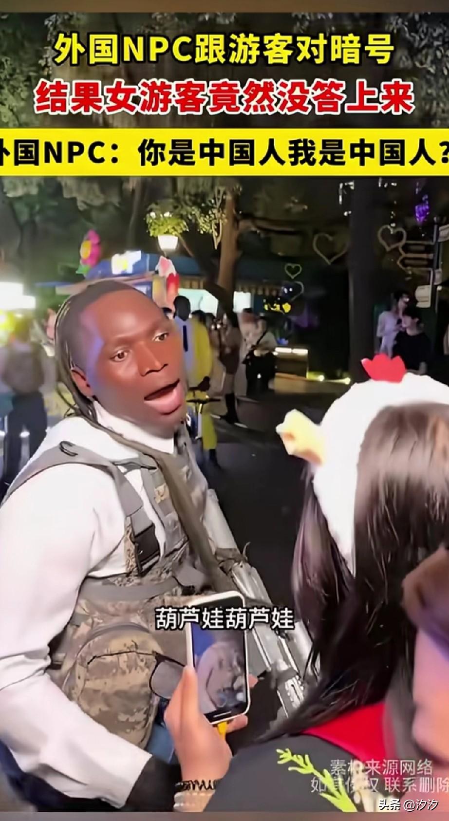 没想到现在景区里面还有外国NPC, 一个小姐姐在景区遇到了老外NPC, 和老外对中国暗号, 老外用中文讲一葫芦娃,葫芦娃, 女网友表示自己不会, 老外又讲一个藤上7个娃, 对游客你有些无语, 直言你是中国人还是我是中国人? 随后来了一句, Baby,我们的爱情好像跳楼机! 这回你又可算是对上了, 过程中可把老外急死了, 这些耳熟能详的暗号, 网友居然不会, 急中生智的他这才用中文歌曲, 要不这任务又完不成了? 大家觉得这个老外好玩吗?