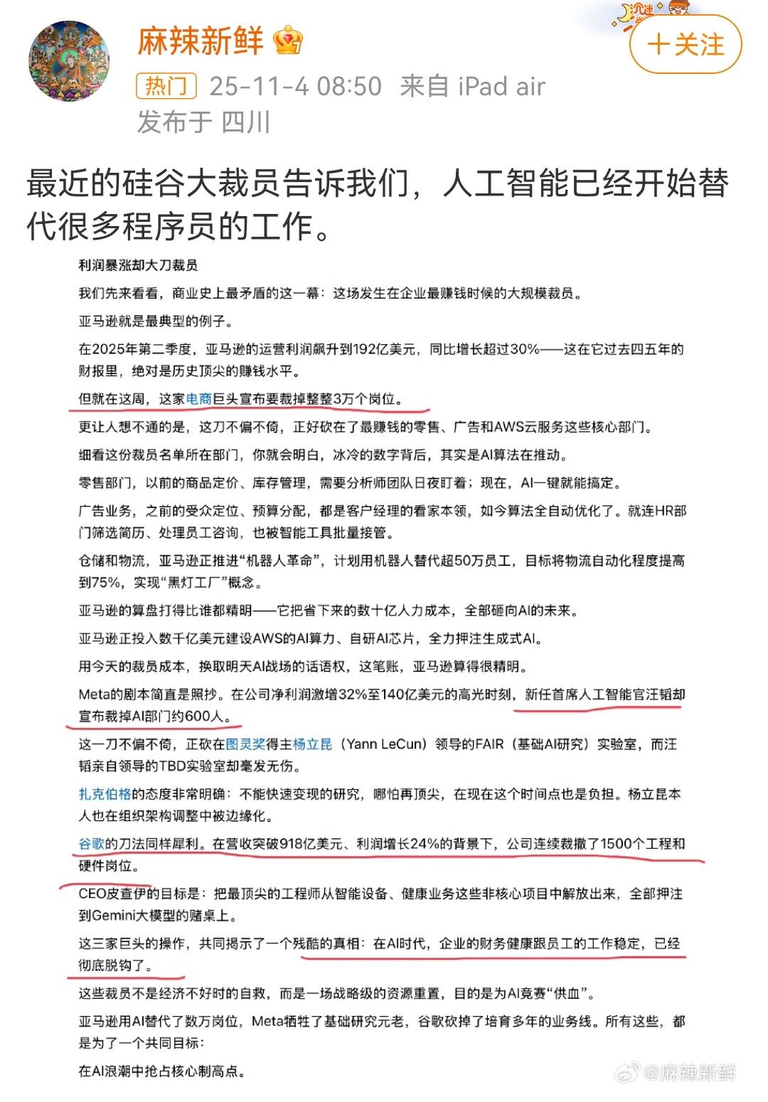 人工智能大发展,高端和低端工作大替代。 (图一)山东济宁一家食品公司,宇树机器人保安上岗,人类当保安的机会都快没有了。 (图二)美国硅谷大裁员,原来IT产业的高薪程序员的工作,已经完全可以被人工智能AI所替代。 人工智能的发展势不可挡,人类的高端和低端工作都可替代,人还能去做什么?