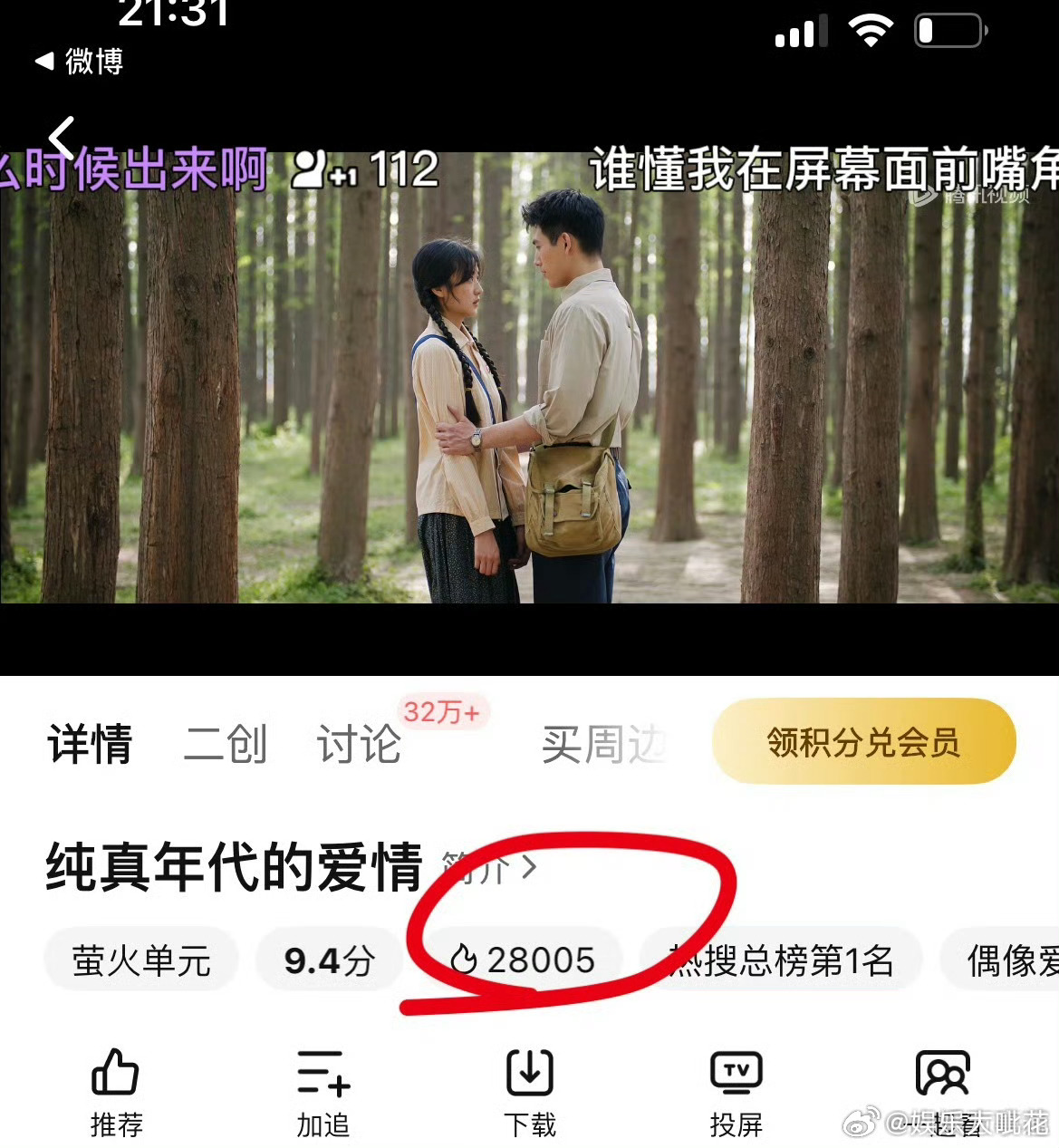 陈飞宇孙千新剧站内热度破28000陈飞宇新剧创萤火单元最高热度值陈飞宇孙千《纯真年代的爱情》站内热度破28000了,目前是🐧萤火单元剧集热度值TOP1,还进入站内的必看俱乐部
