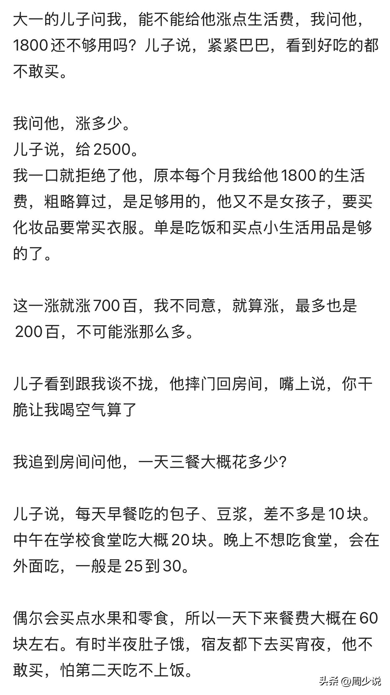 “真快供不起读大学了!”近日,一位妈妈的求助火遍全网:刚上大一的儿子,突然提出要把每月1800元的生活费,涨到2500元,被她一口回绝后,孩子直接摔门进了房间。 原本这位妈妈觉得,1800元对于男生来说完全够用,不用买化妆品、不用频繁添新衣,光是吃饭和日常开销绰绰有余,一次性涨700元实在太夸张,最多只能接受加200元。 可直到儿子一笔一笔算给她听,她才愣住了。早餐10元、午餐20元,晚餐不想吃食堂要花25-30元,再加上水果零食,一天餐费就近60元。除此之外,热水澡3元一次、洗衣2元一次,还有话费、洗漱用品这些零碎开销,算下来1800元确实过得紧巴巴,甚至半夜饿了都不敢跟同学一起吃宵夜。 妈妈坦言:自己一直以为1800元已经算多的,身边也有人说1500元就够花,没想到真实开销远超想象。 此事在网上传开后,网友纷纷破防。有不少网友当即表示:“不是孩子乱花钱,是现在物价真的高”。 也有网友感慨:“我家孩子也是大一,每月2200都不算宽裕”。 还有网友则认为:“不能只看数字,得结合城市和学校实际情况”。 其实这件事,在周少看来,说到底是很多家庭都在面临的亲子沟通与消费教育的问题。很多时候,我们习惯用自己的生活经验去衡量孩子的开销,总觉得“我当年够用,你也应该够用”,却忽略了时代、环境和物价的变化。 家长要多听一听孩子的真实需求,而不是一上来就拒绝。给生活费从来不是单纯的“给钱”,更是教会孩子规划消费、理解生活不易的过程。 不用一味满足过高要求,也不必过度压缩开销,找到一个兼顾实际情况和理性消费的平衡点,比争执更有意义。 总而言之,周少觉得每个月1800元在校足够花了,如果孩子执意要2500元一个月,那就好好商榷了,不能一味满足孩子,更需要量力而行。 大家说,读大学每个月1800元真不够花吗?#寻美三湘# #周少说教育#