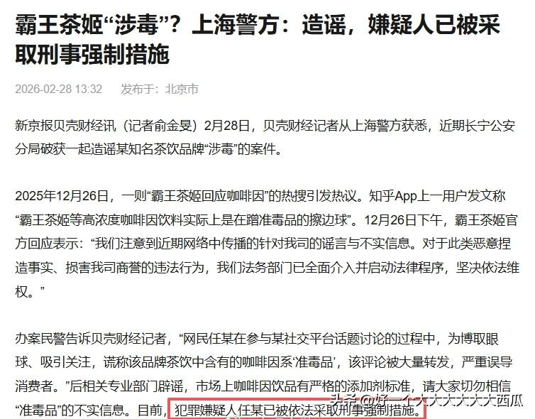 知名博主马督工此前称霸王茶姬疑似“咖啡因系准毒品”, 因此引发大量的转发评论, 引起了网络上一波巨大的舆论风波。 最终马督工这行为被判定是博眼球的造谣行为, 然后他本人也被采取了刑事措施。 当然从这个事情也想到, 罗永浩之前和西贝的网络舆论事件, 罗永浩现在是不是瑟瑟发抖, 因为这种不太准确的指责, 要是引发大规模的舆论风波的话可能会涉嫌破坏营商环境, 毕竟罗永浩这粉丝量规模太容易引发舆情了。