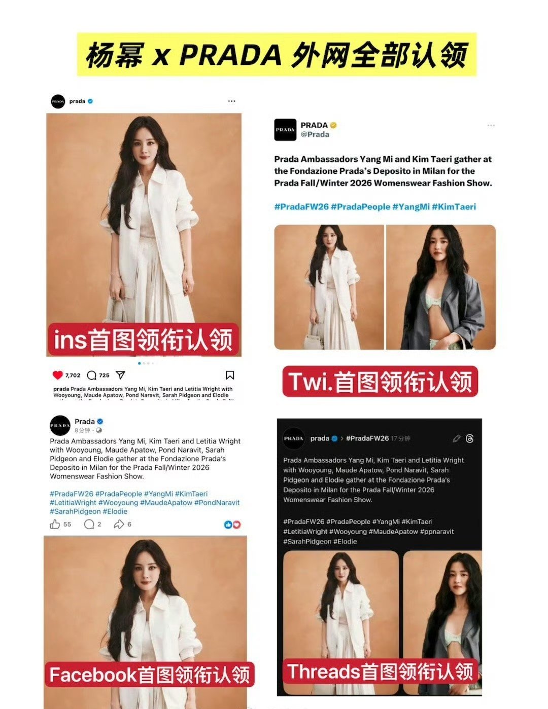 Prada全平台认领杨幂这场迟来两天的官宣,实则是品牌统一宣发节奏的安排。与奥斯卡影后提名者同列首图领衔待遇,外网只此两位——规格本身,已说明一切。