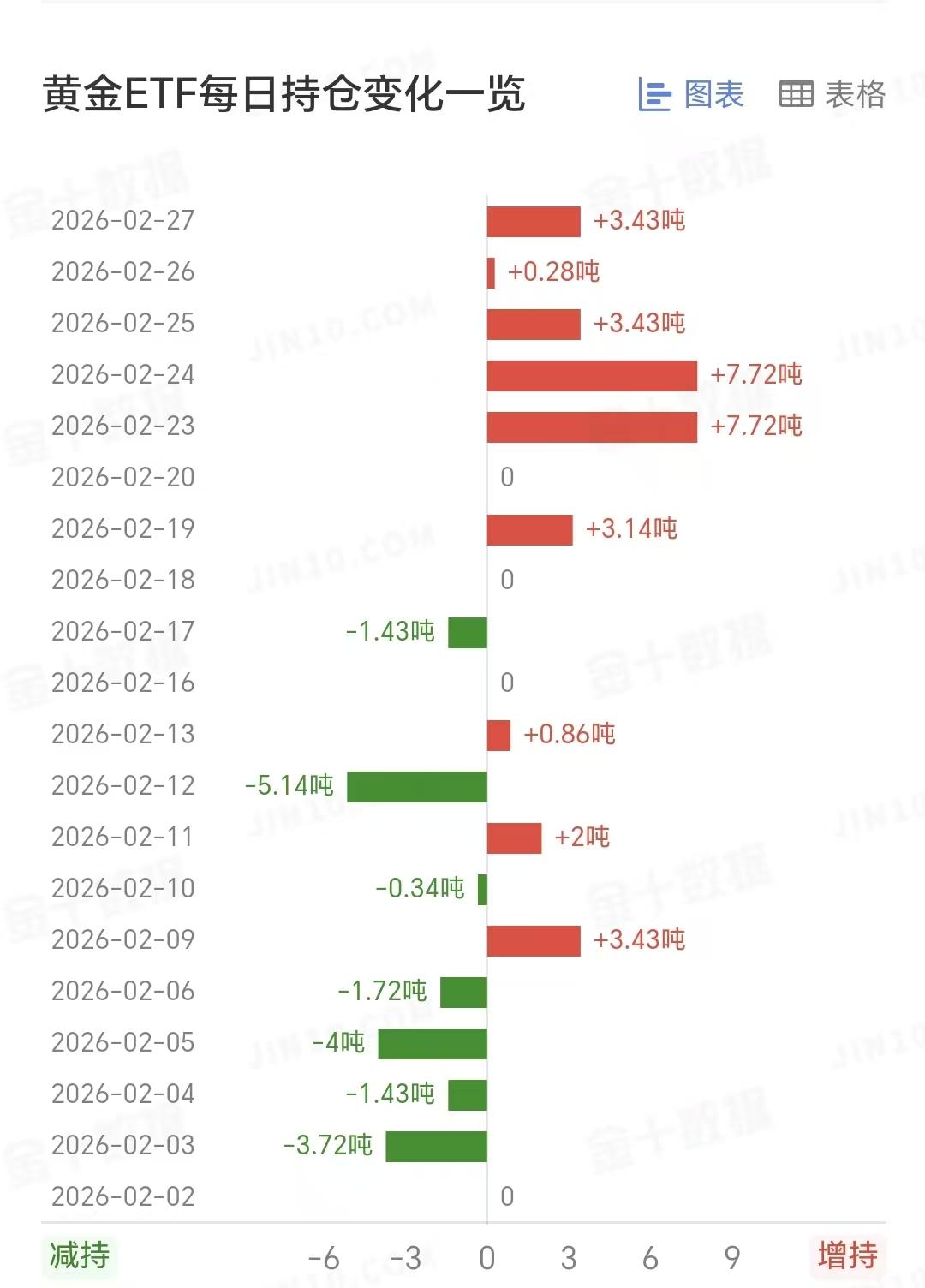 周五国际金价大幅飙升, 创下历史最高收盘价(周五), 那么和其高度相关的 黄金ETF持仓如何变化? SPDR Gold Trust作为 全球最大黄金ETF机构, 根据最新数据显示, 2月27日持仓较上日增加3.43吨, 当前持仓量为1101.33吨。 这是近期第五次增加持仓。