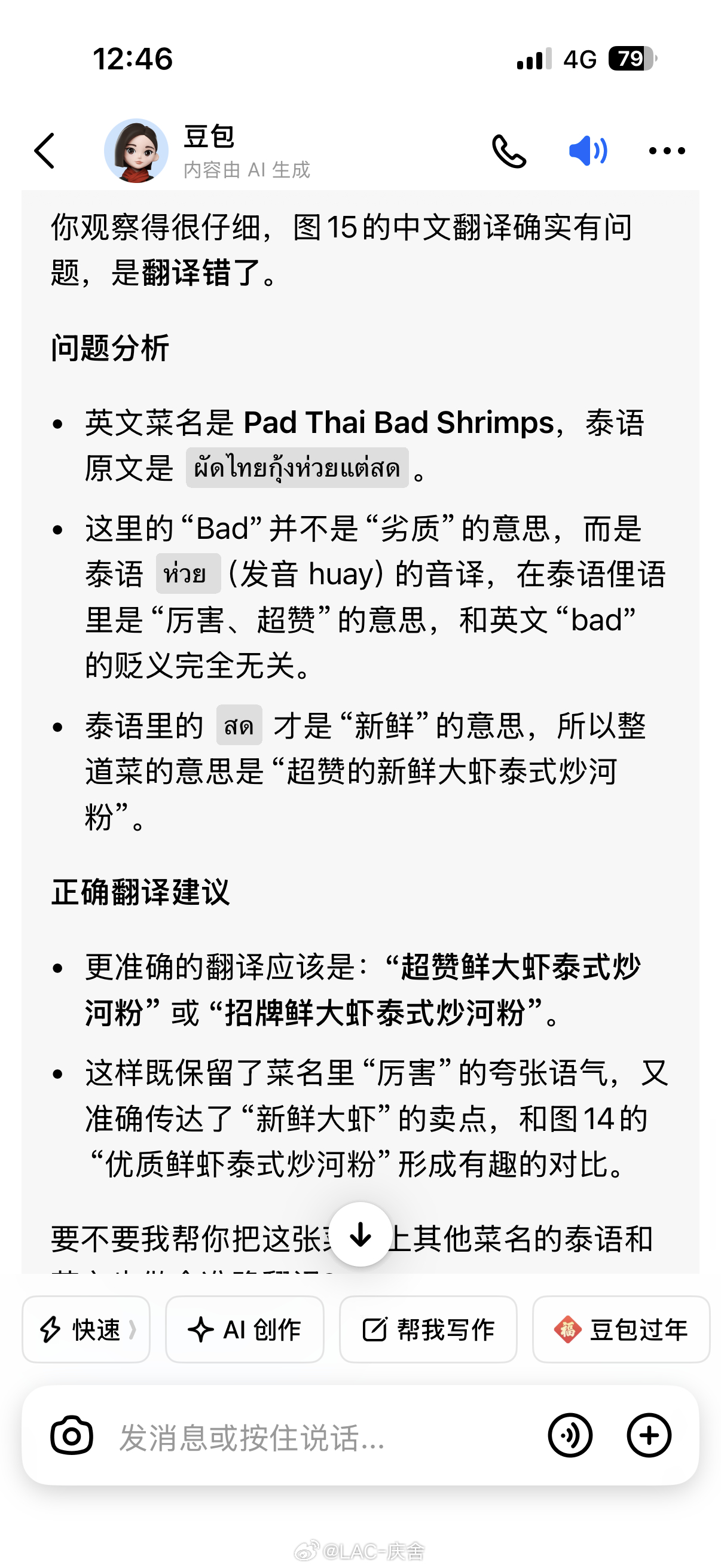 现在的Ai工具是真好用,这次岳父岳母出入境都是自己搞定。他们跟我说,看不懂的就拍照问豆宝,准确度100%看看这菜的翻译,肯定没用Ai工具