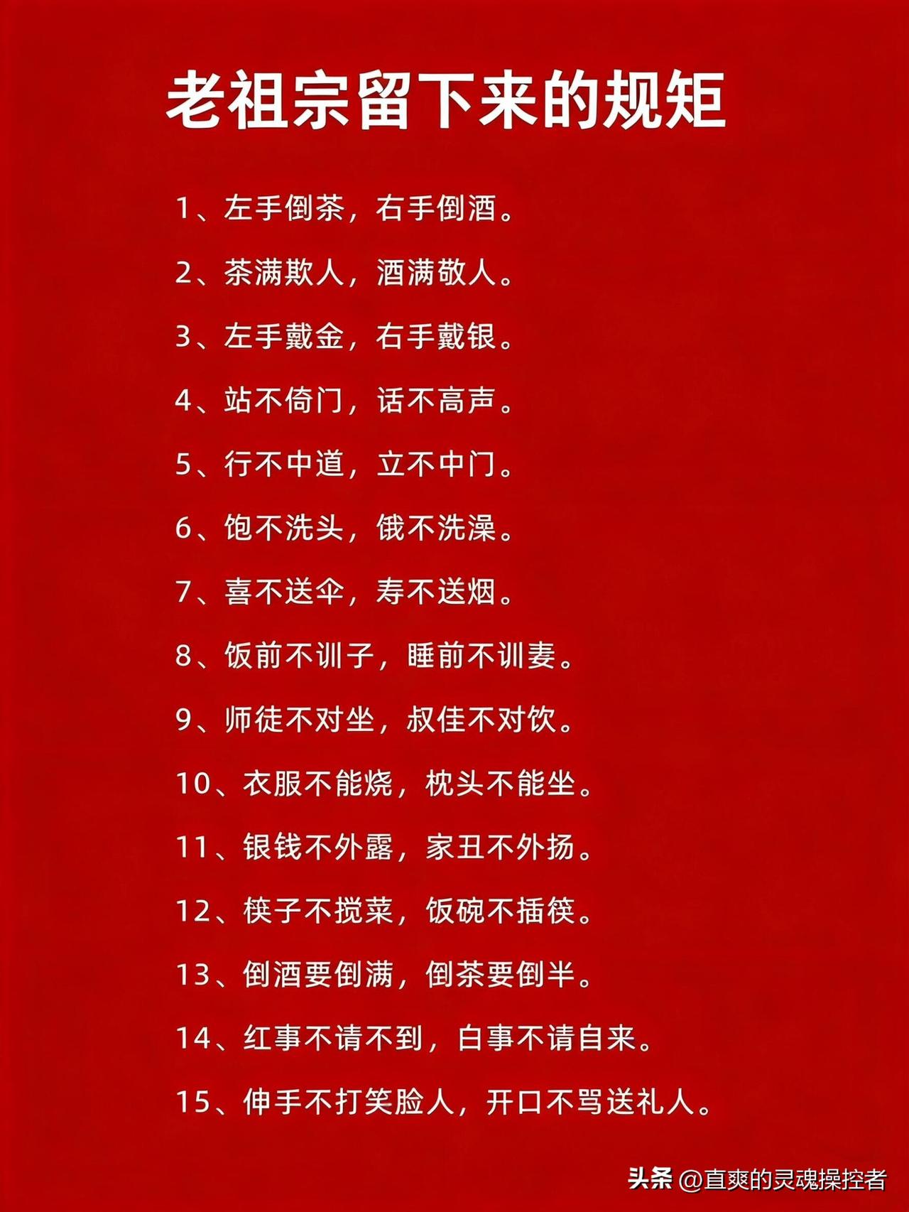 这些老祖宗留下的规矩,是刻在中国人骨子里的处世智慧与待人之道。从“茶满欺人,酒满敬人”的待客之道,到“饭前不训子,睡前不训妻”的家庭分寸;从“伸手不打笑脸人”的包容气度,到“穷不走亲,富不还乡”的清醒自持,每一条都藏着对人情世故的深刻洞察。它们不是刻板的束缚,而是代代相传的教养底色,在举手投足间彰显着分寸与敬畏,至今仍能指引我们在现代社会里行稳致远。老一辈的规矩 九个很准的规矩 处世小原则 处事古训 老祖宗那些规矩 四句古训