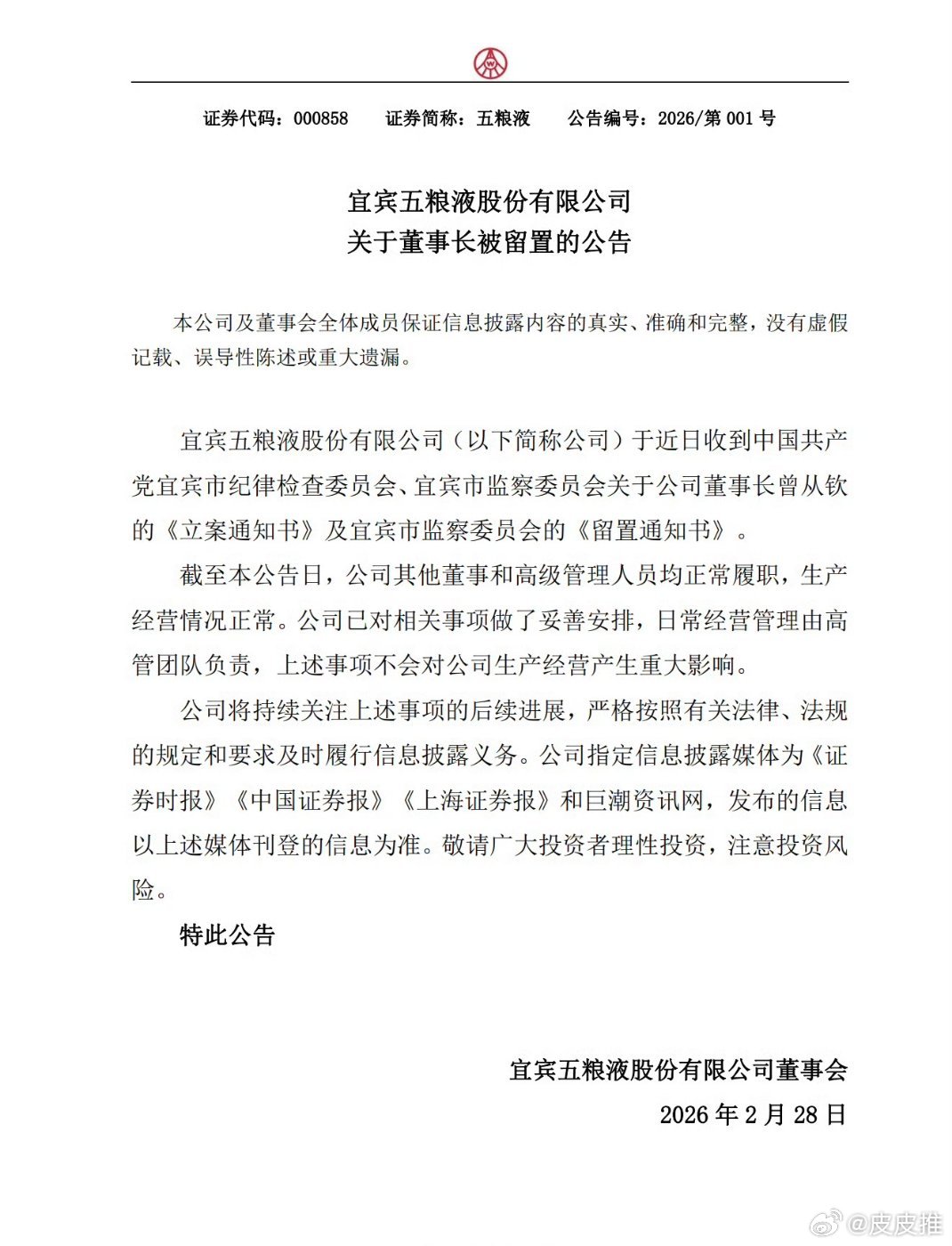 五粮液董事长曾从钦被查2月28日,五粮液发布公告,回应董事长被查。