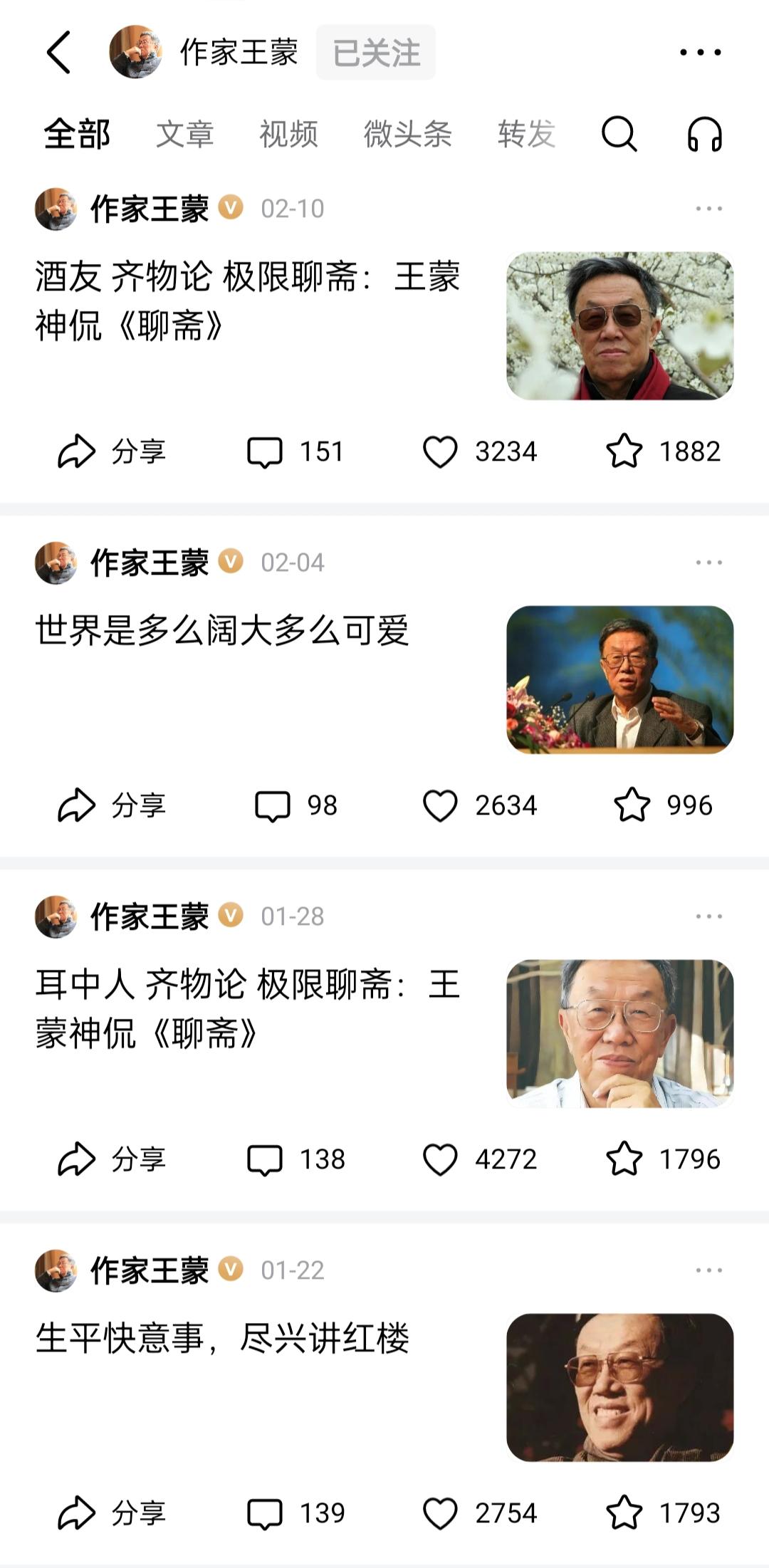 老作家王蒙在头条上的更新频率大约是一周一次,对于90岁的老人来说,这已经非常难得。老先生更新的文章,都很值得一读。 我以前很少看他的文章,记忆最深刻的,是他曾在电视上参加一档汉字文化节目,担任评委。每次点评选手时,他其实都是在传授经验,点评恰到好处,让人回味无穷。 头条上有不少值得一读的文章,王蒙老先生的文章就是其中之一。我也经常阅读,还特地关注了他。有时候隔几天就去他的主页看一看,有没有新内容。现在我基本摸清了他的更新规律,大约一周更新一次。 王蒙老先生是文坛的常青树,几十年来,他的作品影响深远。而他对待生活积极乐观的态度,更值得现在的年轻人学习。 (图片来源:头条)