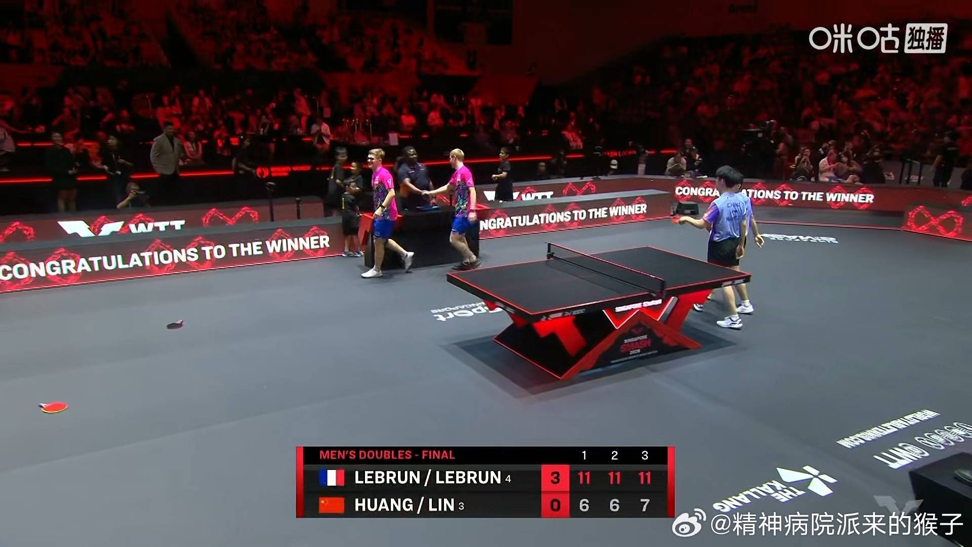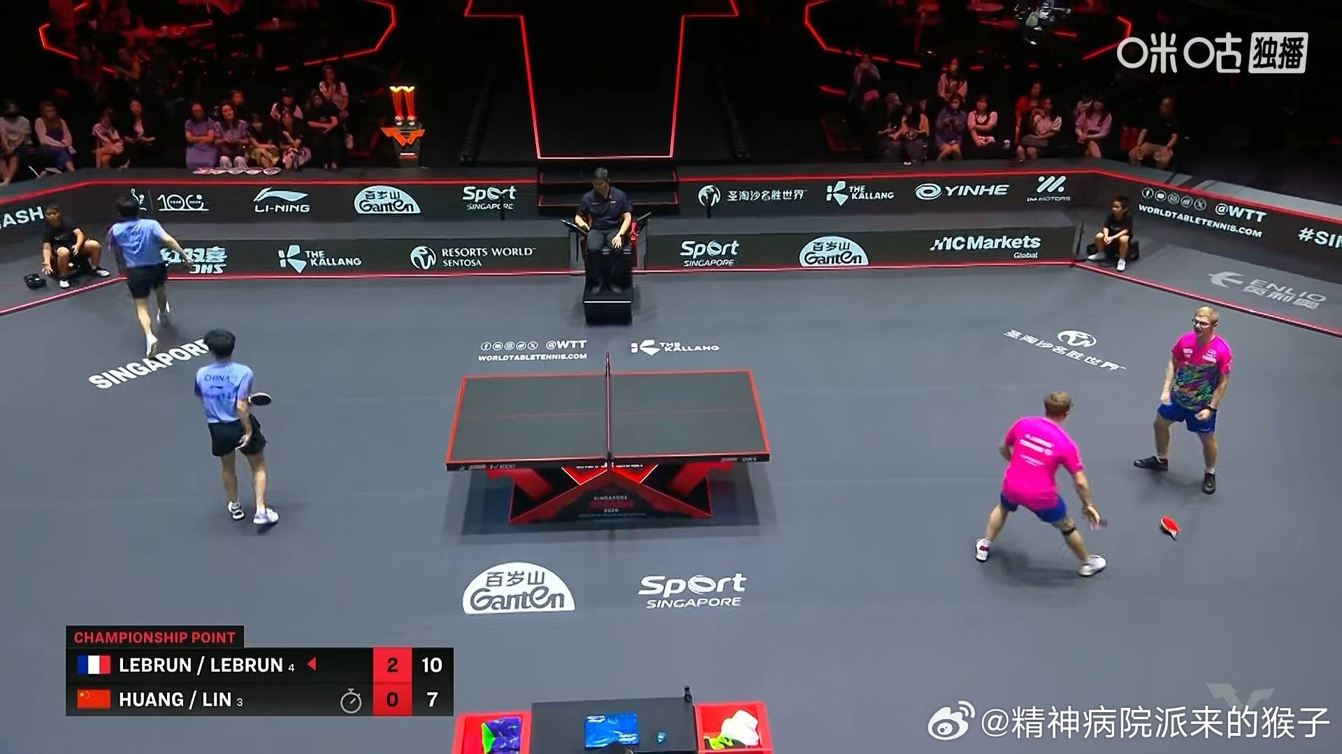 林诗栋黄友政0比3勒布伦兄弟(-6,-6,-7)获得2026WTT新加坡大满贯男双亚军🥈勒布伦兄弟获得冠军🏆首夺大满贯冠军至此中国队本站三项双打赛事都无缘了最高领奖台