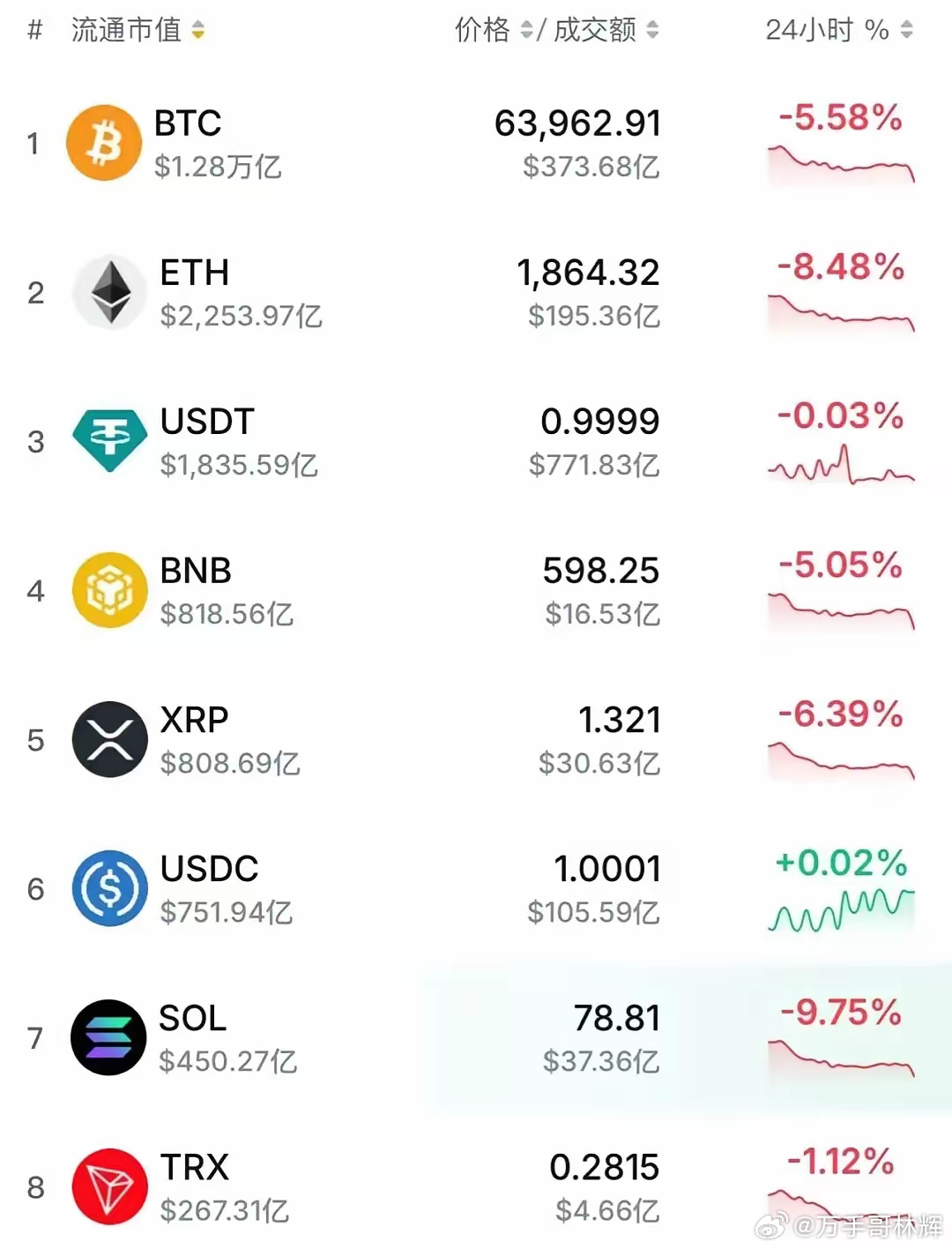 Solana币跌近10%,BNB跌超5%。