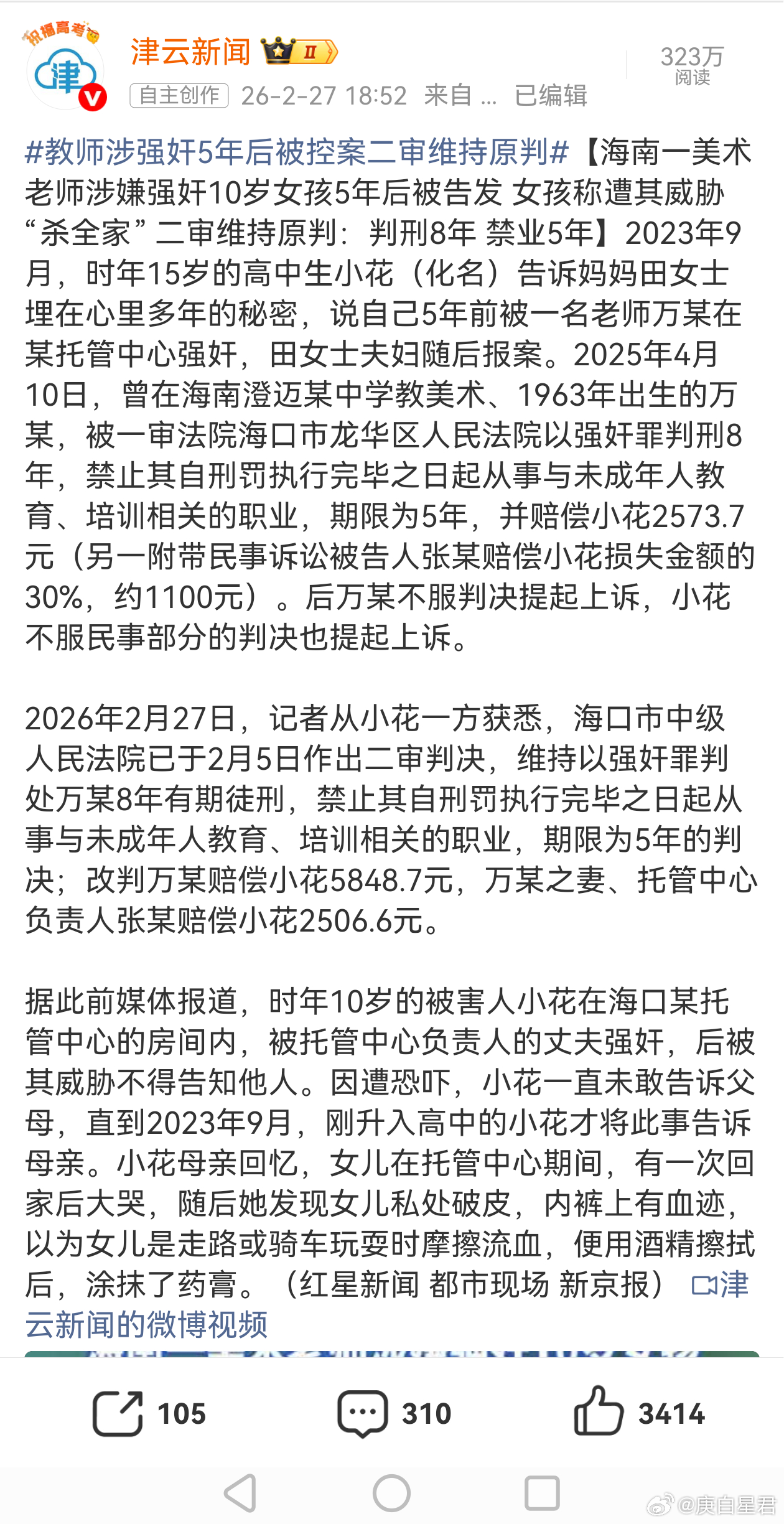 今天的文章很单纯,就是为了让禽兽老师扬扬名,顺道科普科普:2023年9月,时年15岁的高中生小花(化名)告诉妈妈田女士埋在心里多年的秘密,说自己5年前被一名老师万某在某托管中心强奸,田女士夫妇随后报案。2026年2月27日,记者从小花一方获悉,海口市中级人民法院已于2月5日作出二审判决,维持以强奸罪判处万某8年有期徒刑,禁止其自刑罚执行完毕之日起从事与未成年人教育、培训相关的职业,期限为5年的判决;