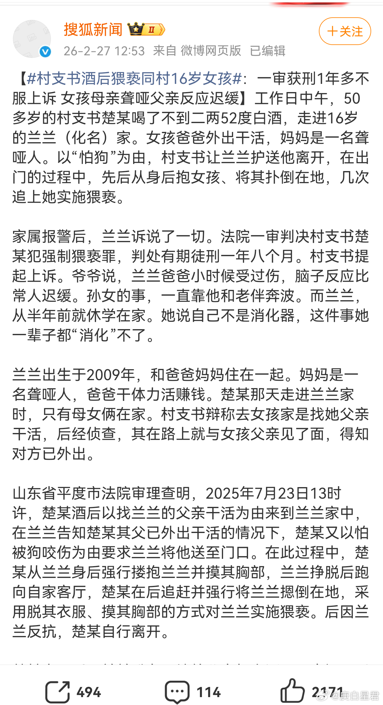 看今天的一个【村支书酒后猥亵同村16岁女孩 的猥亵新闻