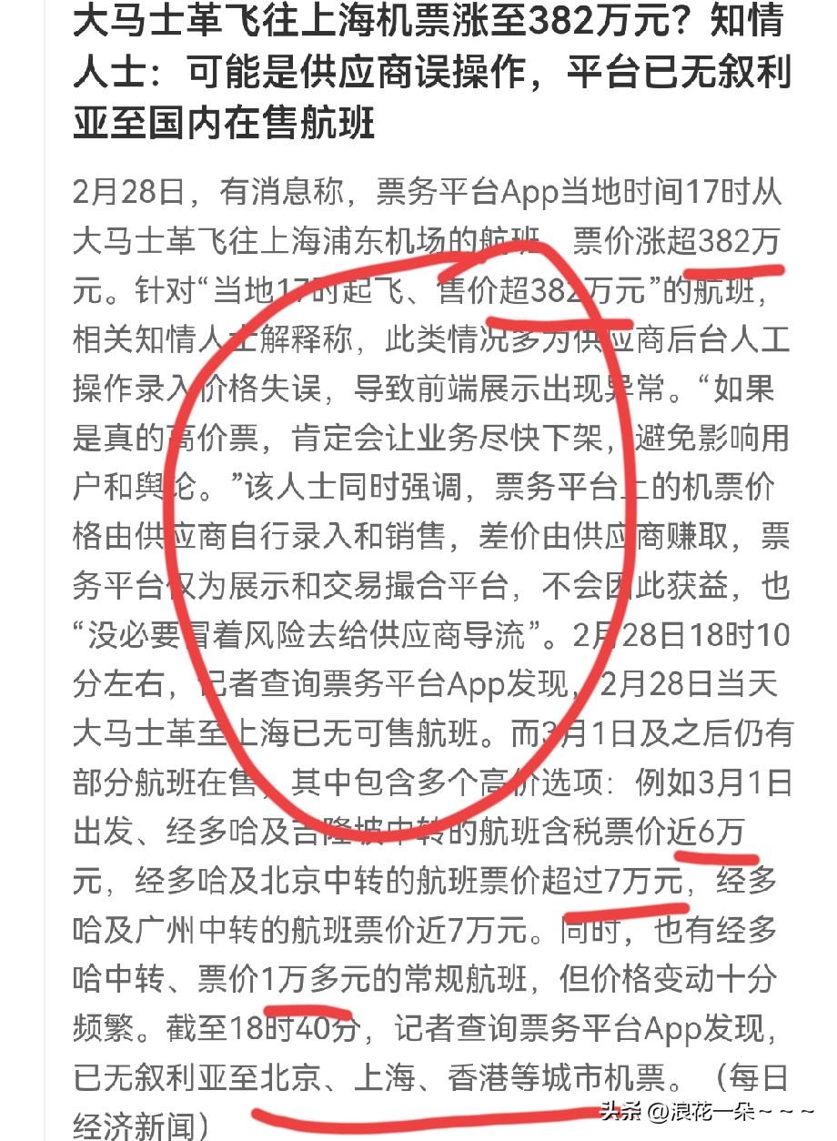 哦豁!从中东出来的飞机票都涨到天上去了?怎么大马士革飞往上海的机票都到了382万元?还好可能是供应商误操作,否则,这来回一趟得付出多大代价? 不过现在需要提醒大家的是在外一定要注意安全,现在不光是从伊朗出来的机票涨价了或者是没有航班了,这次美国和以色列打击伊朗已经波及到中东10个国家了,也就是说从10个国家出来的航班可能都没有了,即使有票价也会跟以前绝对不一样! 我刚才看到携程都出通知了,针对伊朗局势,酒店给予兜底保障。所以在外面住携程酒店吧,可能还会安全一点。实在要想回来一是付出的代价比较大,二是航班几乎都暂停了。