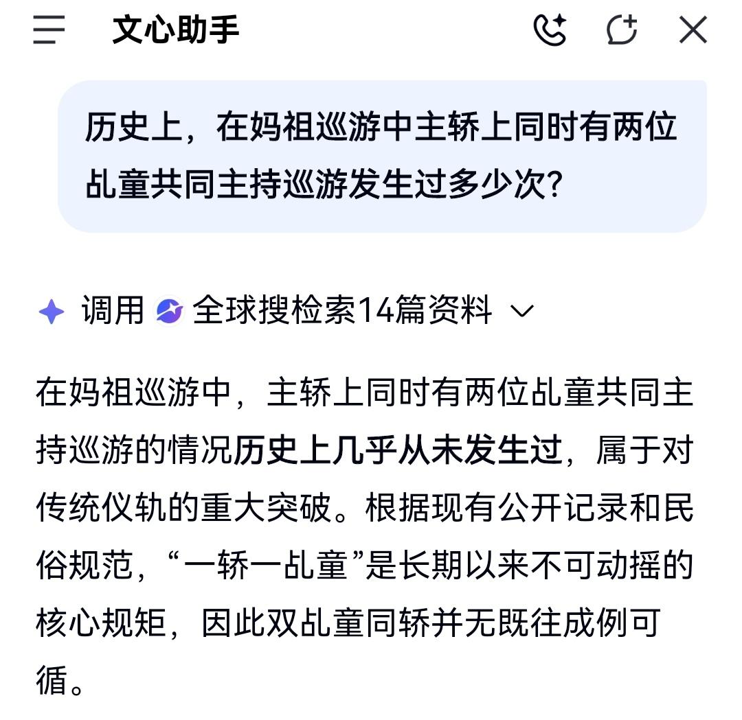 我问:历史上,在妈祖巡游中主轿上同时有两位乩童共同主持巡游发生过多少次? Deep Seek回答:我没有查到任何一例确切的、两位乩童同时在主轿上主持巡游的记录。 不管是《湄洲妈祖志》这类权威志书,还是知网的学术论文,或是各宫庙自己的大事记,都没有对“某年某月某日,主轿上是两个人”这种细节的描述。 文心助手回答见图: