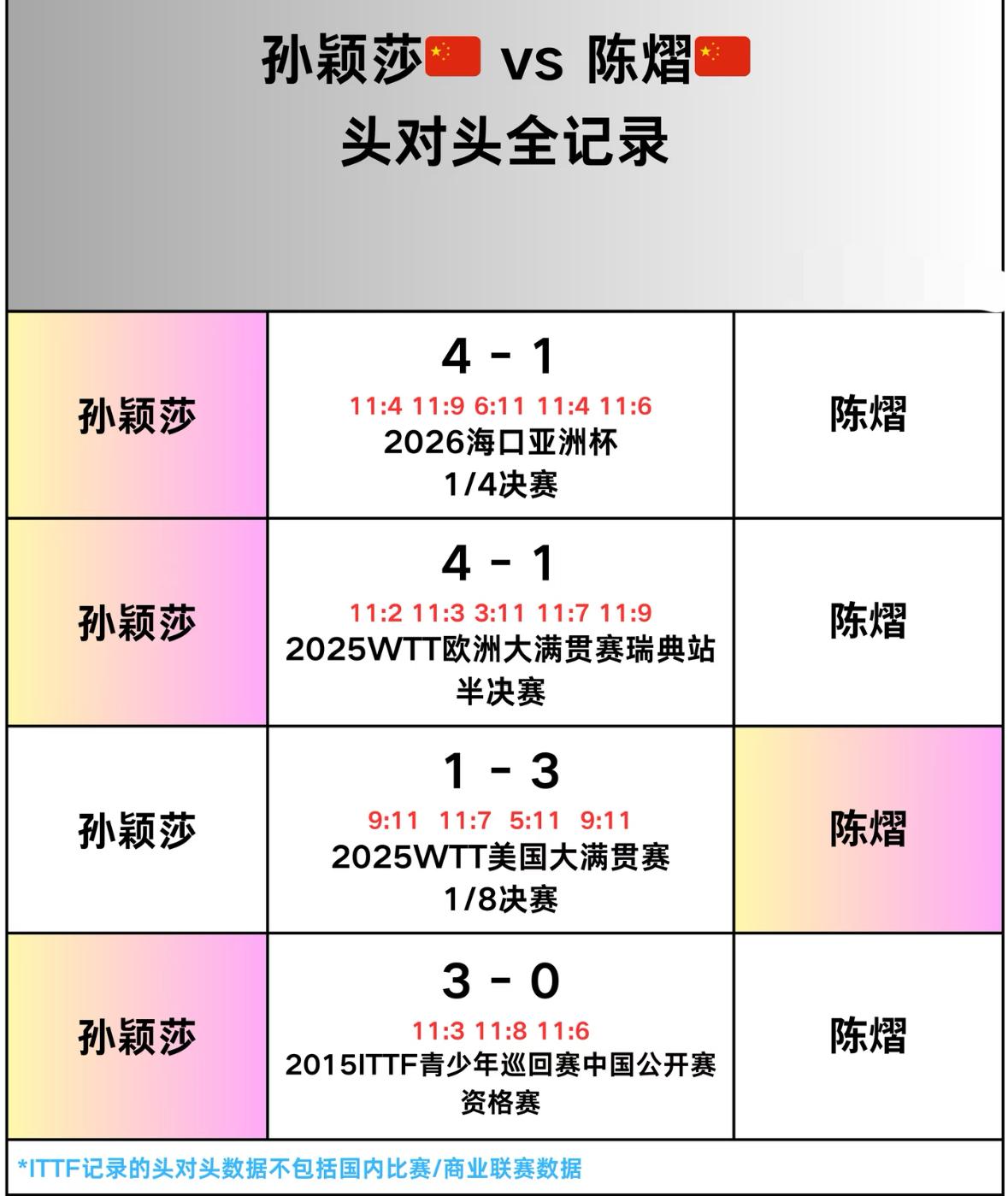孙颖莎与陈熠的头对头全记录——新加坡大满贯女单半决赛对阵 孙颖莎VS陈熠, 从以往的交手记录来看, 孙颖莎对陈熠保持三胜一负的 优势战绩。 两个人最后一次交手是在半个月前的 海口亚洲杯女单1/4决赛上, 当时孙颖莎4:1陈熠, 但孙颖莎在采访中也说了, 陈熠最近状态很好, 成绩稳定,是一名冲击力强的 小将,半决赛和陈熠打, 没有心理包袱, 做好自己,打好每一分! 莎莎说过, 每一场比赛都是新的开始, 走下领奖台一切归零, 尊重对手,敬畏赛场, 3月1日12:45 孙颖莎加油, 陈熠加油!