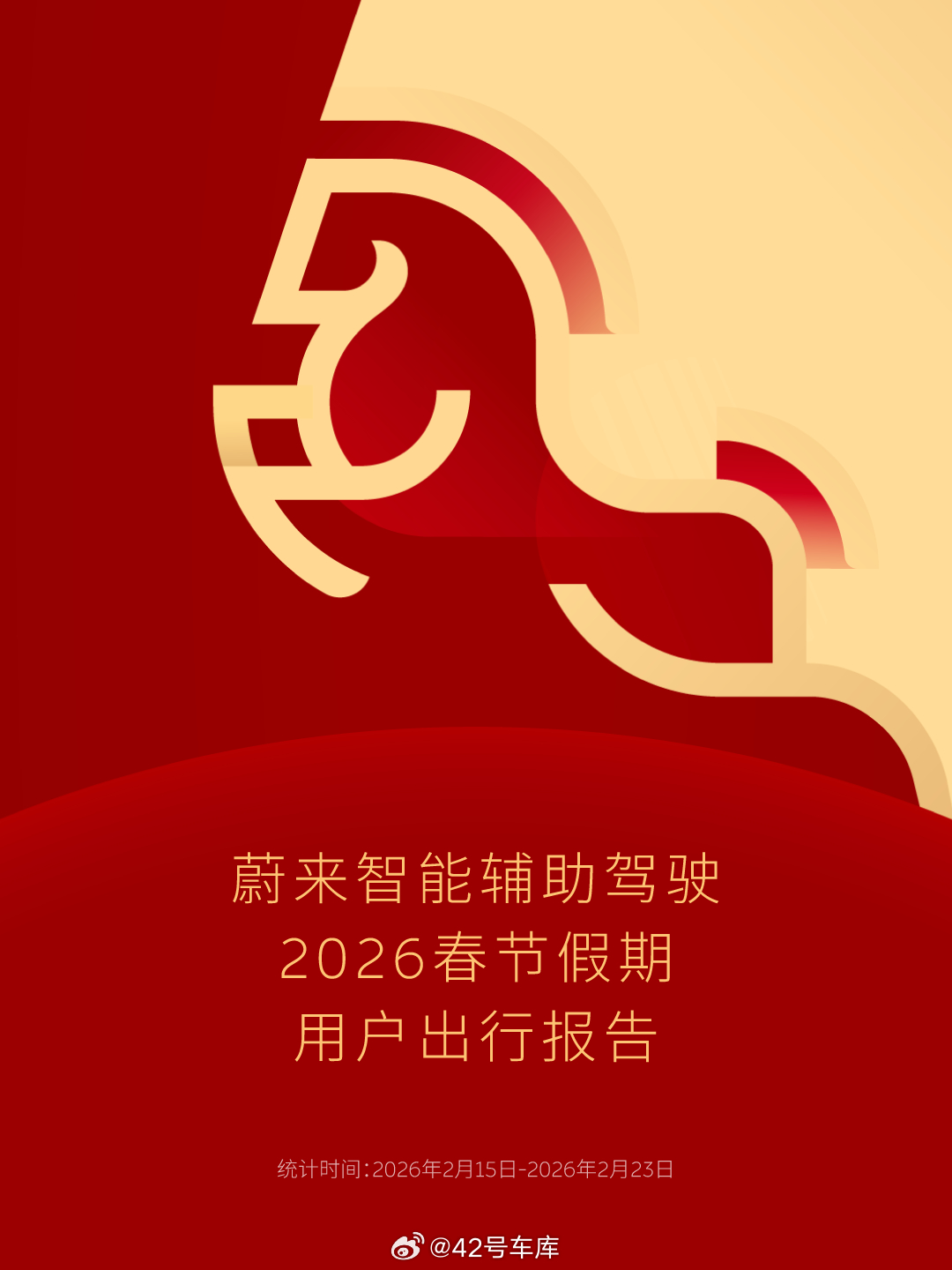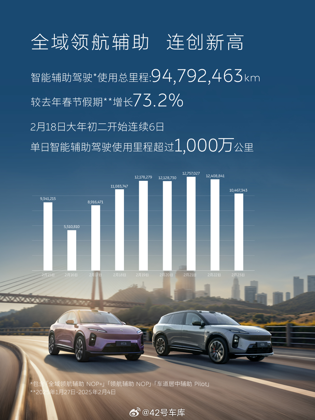 蔚来的春节辅助驾驶出行报告也来了,用户使用总里程接近 9,500 万公里