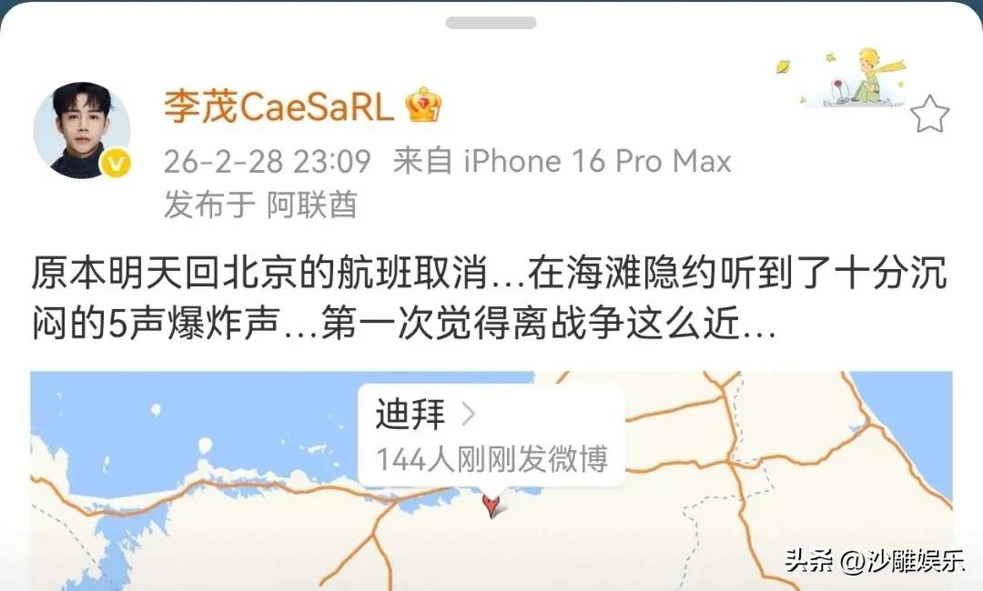 李茂,深夜发文! 2月28日,李茂在社交平台敲下的那段文字,让无数网友心里咯噔一下:“原本明天回北京的航班取消了……在海滩隐约听到了十分沉闷的5声爆炸声……第一次觉得离战争这么近。” 寥寥数语,没有华丽的辞藻,却透着透骨的寒意。那种在异国他乡,被突如其来的爆炸声打破宁静的恐惧,隔着屏幕都能感受到。 李茂这看似个人的“碎碎念”,其实恰好踩中了中东局势骤然升级的惊心动魄节点。就在他发文当天,伊朗为报复美以此前的联合空袭,真的对阿联酋等海湾国家的美军基地动手了! 我们查证了多方信源,这不是李茂的幻觉,更不是危言耸听——阿布扎比和迪拜确实传出了爆炸声,甚至有一名外国人不幸在导弹碎片落下时遇难。 随后,阿联酋宣布关闭部分领空,迪拜两大国际机场所有航班瞬间“停摆”,这才有了李茂那句无奈又无助的“航班取消”。 说实话,我们看惯了明星在红毯上的光鲜,看惯了他们在综艺里的嬉笑,但这一次,李茂以一个普通“被困者”的身份,让我们看到了战争阴云下最真实的个体反应。当世界第一高楼哈利法塔都要紧急疏散人群时,当度假胜地突然可能变成危险地带时,什么名利,什么通告,都不如“平安回家”四个字来得实在。 愿李茂和在当地的每一位同胞,都能早日平安归来。这和平,真的,弥足珍贵。