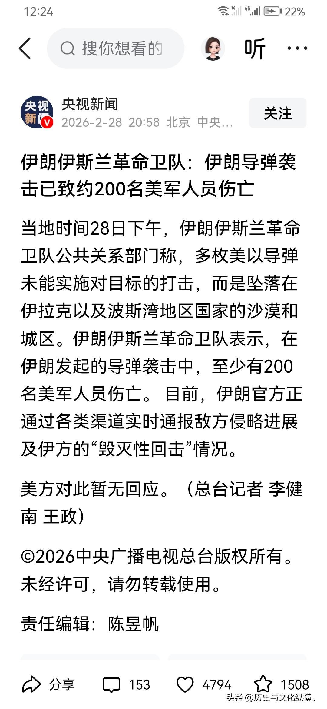 伊朗发布第一天战果,约200名美军被炸死炸伤。 伊朗称,这次战争没有红线。意思凡