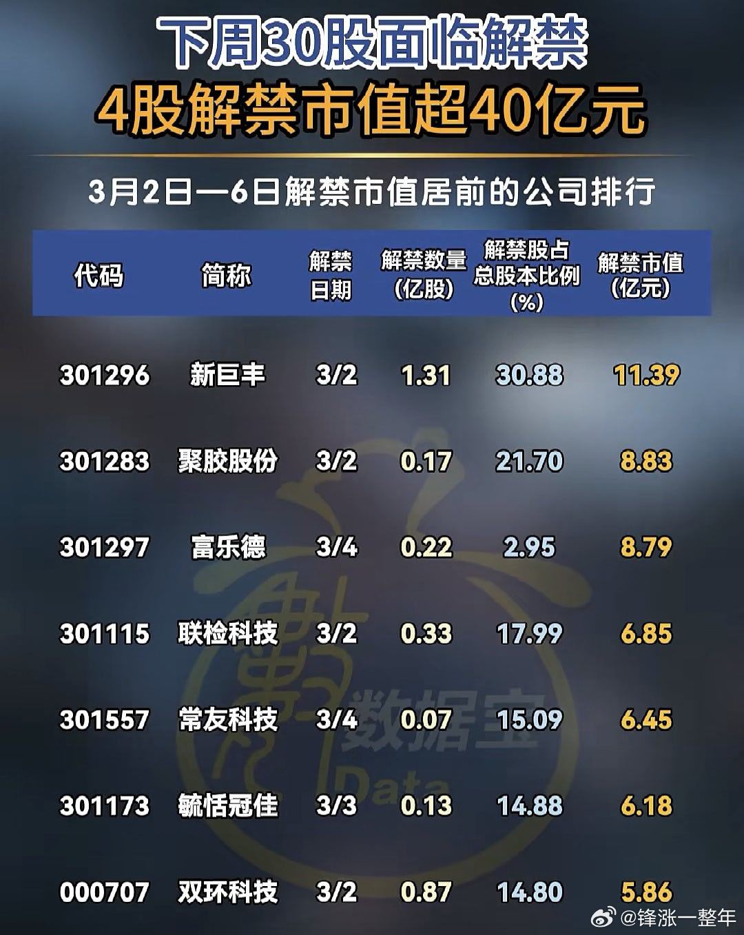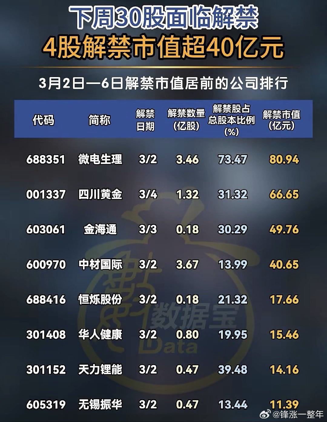 下周解禁市值居前股名单A股