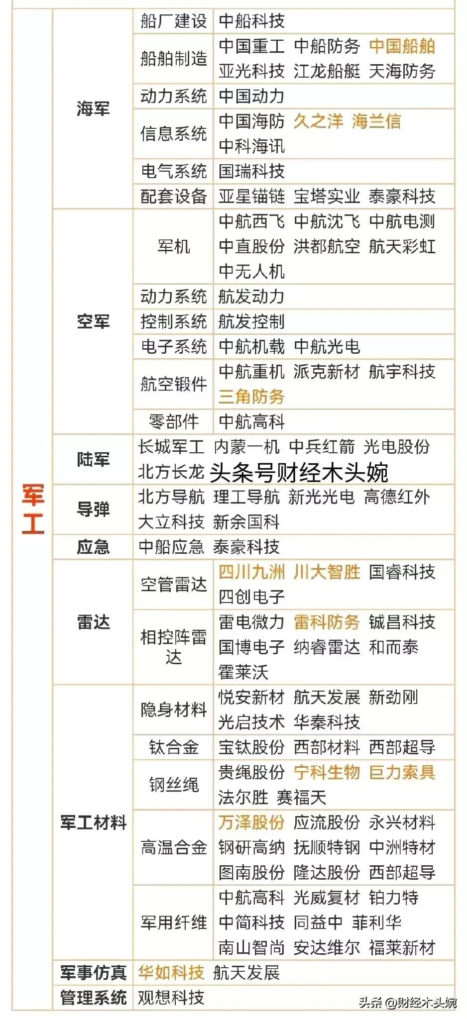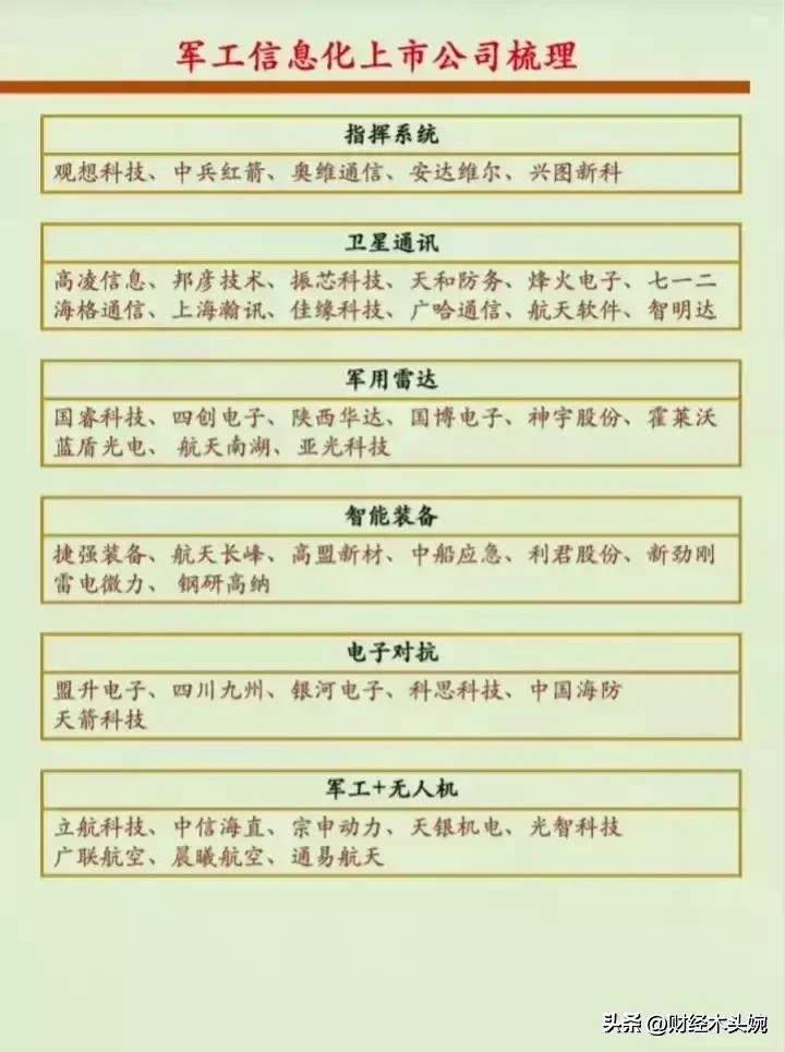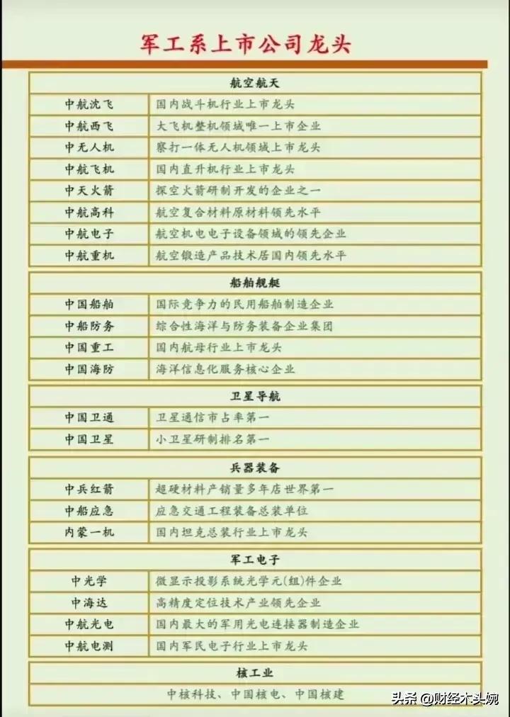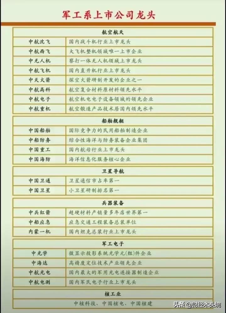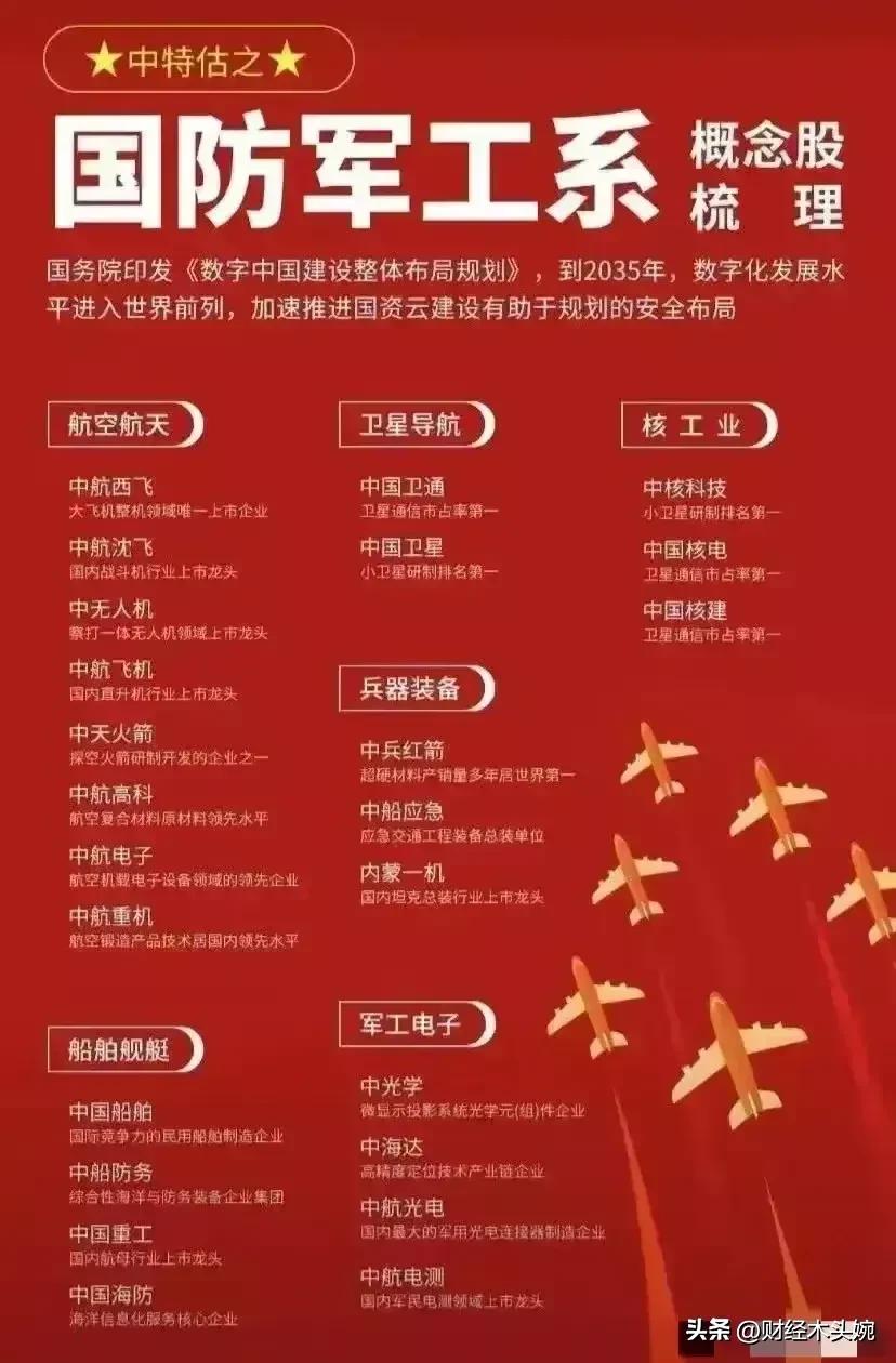 打起来了,国防军工概念全面梳理! 28日突发消息,中东乱成一锅粥,国防军工概念迎来政策、地缘、产业三重利好共振,整体呈现“高景气+强催化”的向上态势。相关概念细分领域龙头代表有哪些? 2026年国防预算稳步增长,预算约1.78万亿元,重点倾斜装备采购与新质战斗力。叠加地缘局势催化,中东冲突升级,中式装备性价比凸显,军贸预期强化。直接利好四大军工细分赛道,核心标的集中在无人机、精确制导、防空与整机。 军工利好概念龙头代表:中无人机(中东军贸核心供应商)、北方导航(导弹导航与控制核心)、国睿科技(军工雷达龙头)、内蒙一机(陆军主战装备)、中国海防(水下与要地防御)、 中兵红箭(智能弹药与导弹战斗部龙头)………… 理财有风险入市需谨慎!资料取材网络仅供参考不能作为投资依据。 - 航天彩虹(002389):彩虹系列无人机,订单饱满、军贸毛利领先。