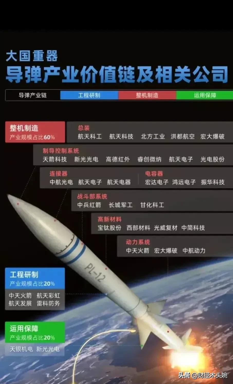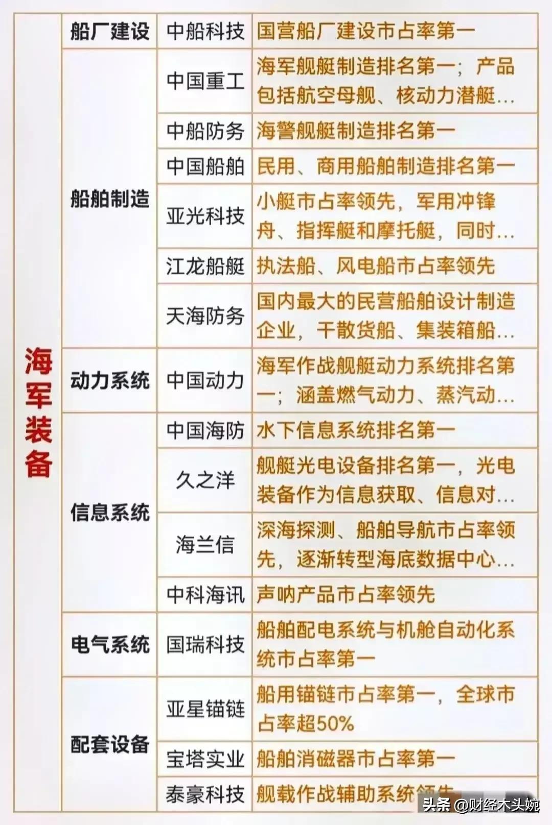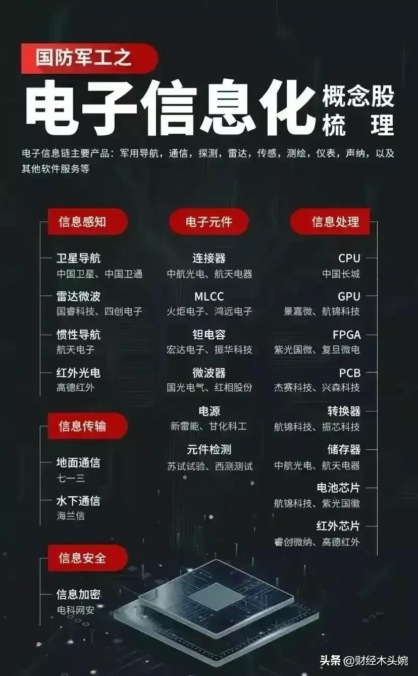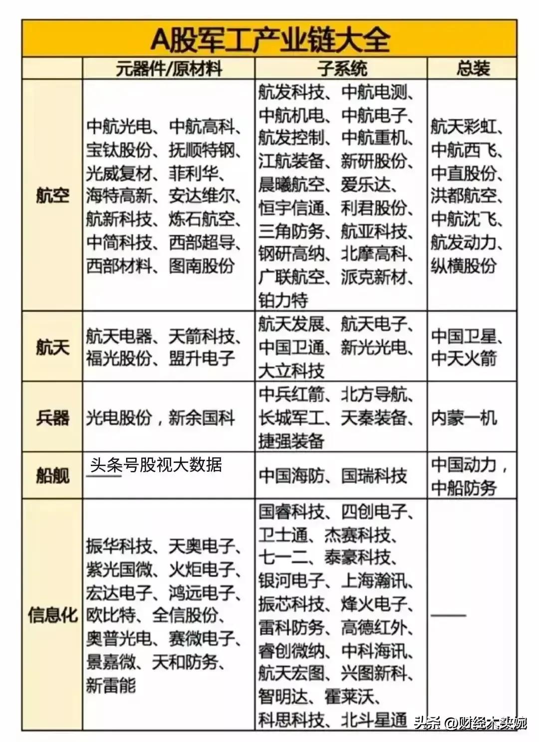 打起来了,国防军工概念全面梳理! 28日突发消息,中东乱成一锅粥,国防军工概念迎来政策、地缘、产业三重利好共振,整体呈现“高景气+强催化”的向上态势。相关概念细分领域龙头代表有哪些? 2026年国防预算稳步增长,预算约1.78万亿元,重点倾斜装备采购与新质战斗力。叠加地缘局势催化,中东冲突升级,中式装备性价比凸显,军贸预期强化。直接利好四大军工细分赛道,核心标的集中在无人机、精确制导、防空与整机。 军工利好概念龙头代表:中无人机(中东军贸核心供应商)、北方导航(导弹导航与控制核心)、国睿科技(军工雷达龙头)、内蒙一机(陆军主战装备)、中国海防(水下与要地防御)、 中兵红箭(智能弹药与导弹战斗部龙头)………… 理财有风险入市需谨慎!资料取材网络仅供参考不能作为投资依据。 - 航天彩虹(002389):彩虹系列无人机,订单饱满、军贸毛利领先。