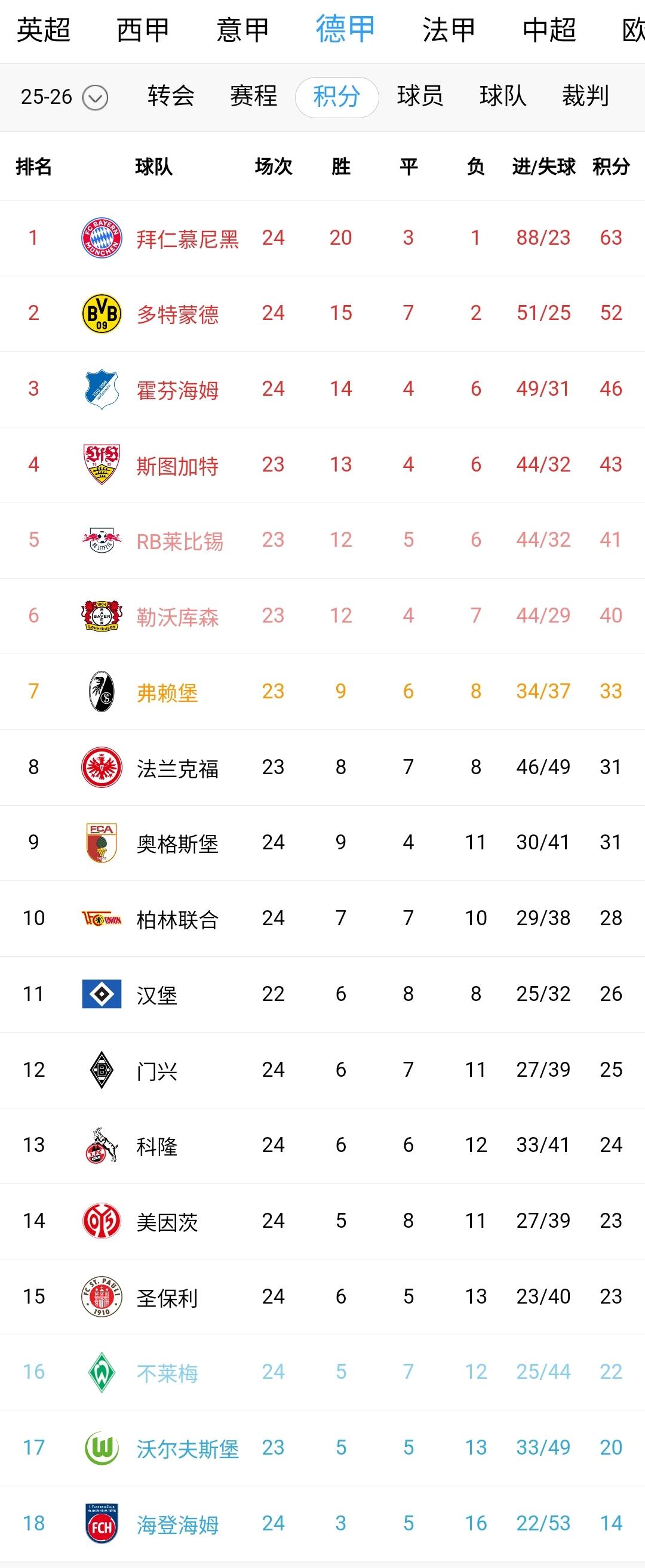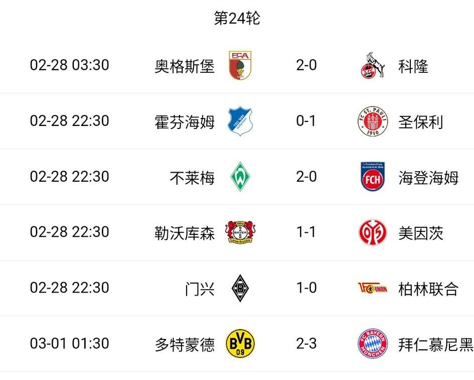 拜仁3-2绝杀多特蒙德!一家独大,拜仁基本锁定联赛冠军! 多特蒙德积分被拜仁拉大到11分了,联赛只有10轮了。 圣保利1球险胜霍芬海姆脱离降级区。门兴赢球保级更安全。 科隆输球、美因茨平局,保级形势严峻。