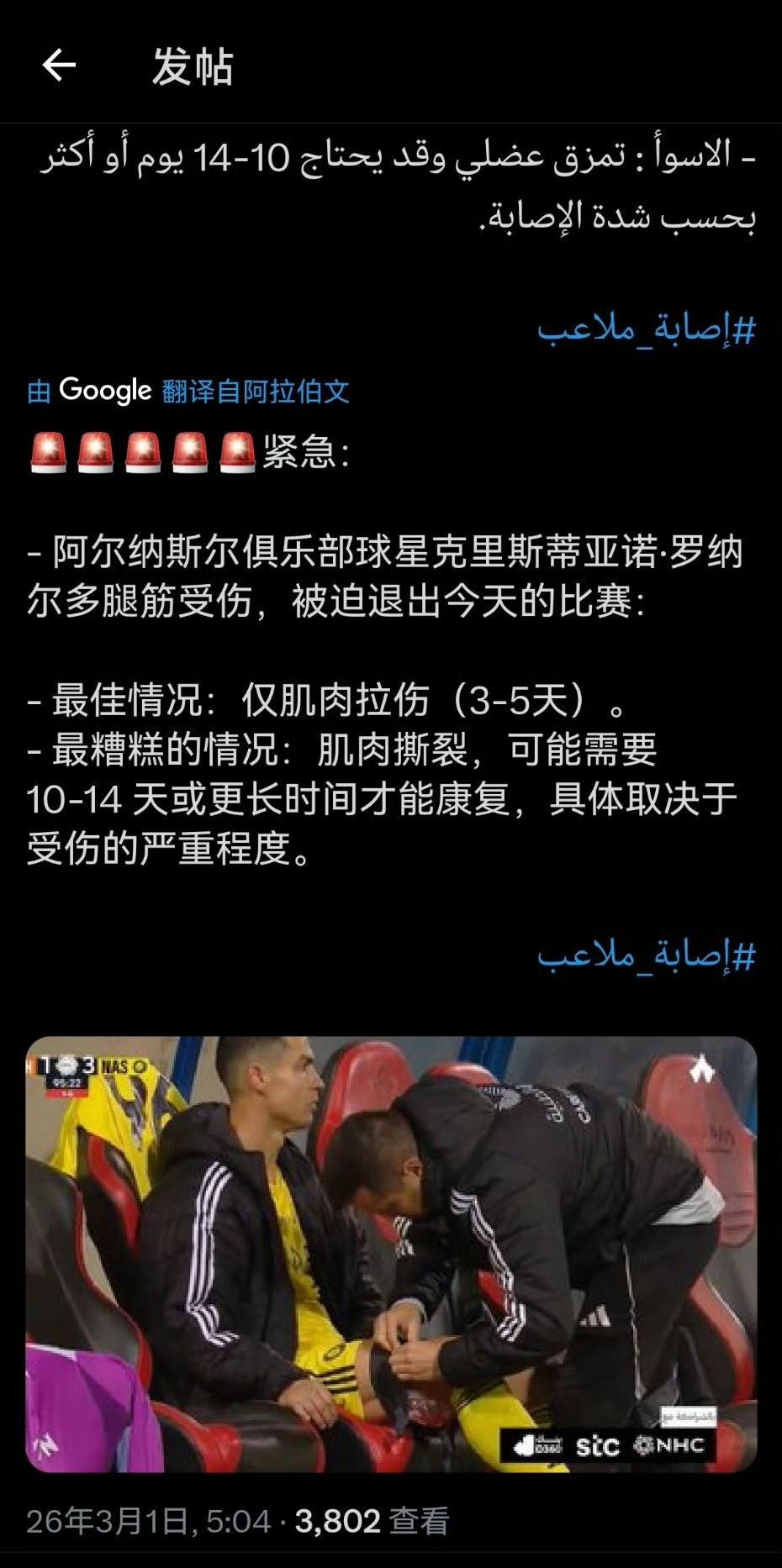 小鬼当家!菲利克斯和哈姆丹轮番撞墙,最后哈姆丹进球,利雅得胜利3-1锁定胜局。 遗憾的是随后C罗受伤被替换下场。所以这个赛季他频繁提早下场不是没有原因的。