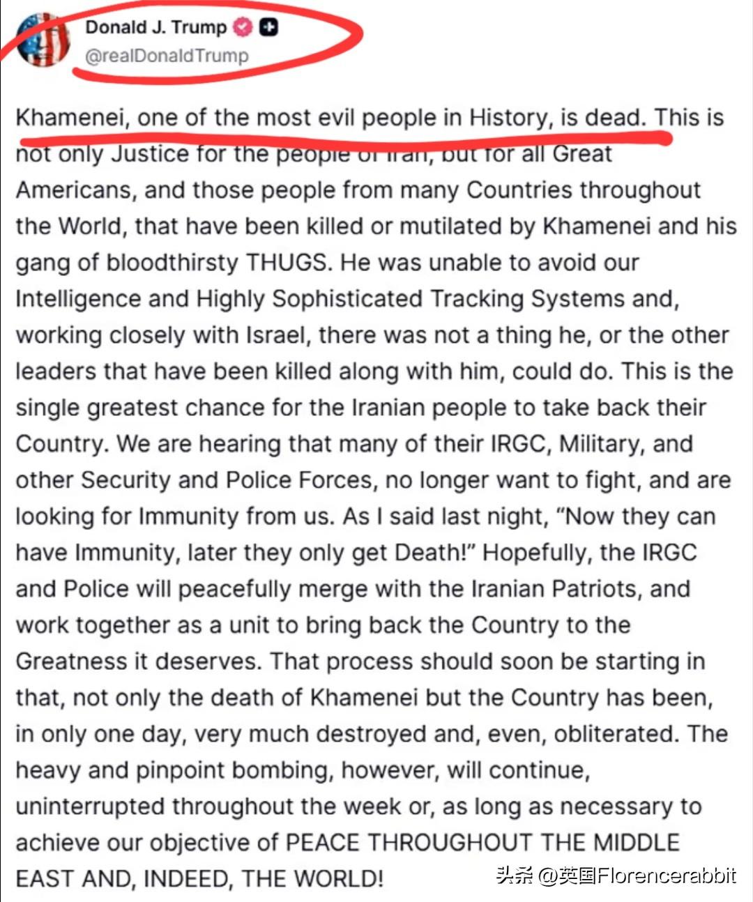 美国总统特朗普宣布,美国已击毙伊朗最高领导人阿亚图拉·阿里·哈梅内伊。 今天他在家坐镇指挥,而后在社交真相上发布称 “史上最邪恶的人之一哈梅内伊死了”。 在美国和以色列对伊朗发动空袭后,德黑兰,哈梅内伊的住所大院上空升起烟雾。