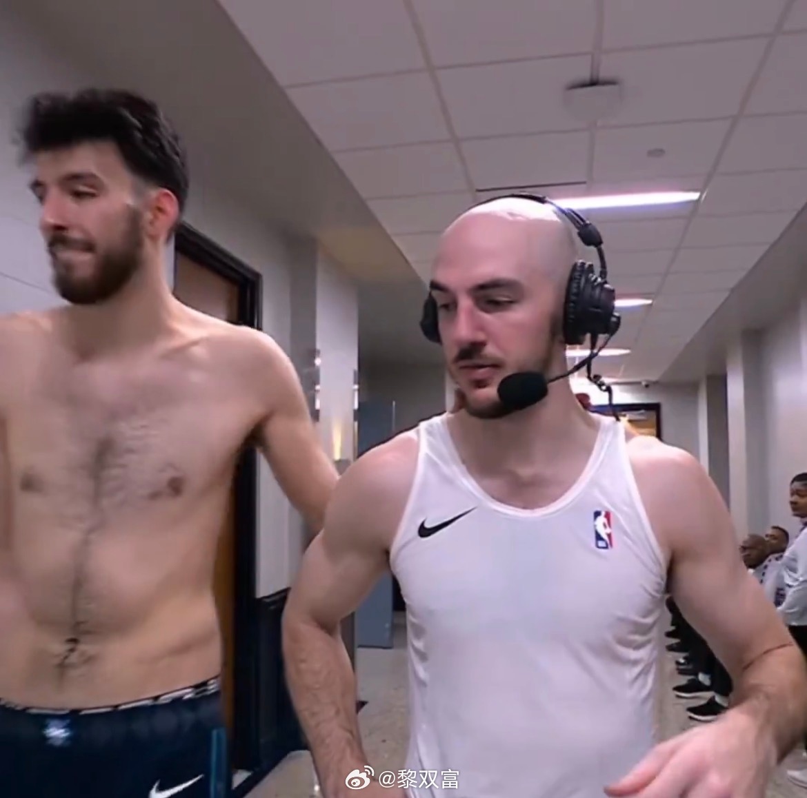 卡鲁索赛后跟Inside The NBA视频连线时,霍姆格伦光着上半身路过镜头前,巴克利说:赶紧跟他说,让他穿件衣服,他的身材还不够好到能光着膀子到处走。 此前在场地采访时,哈腾将卡鲁索的发带摘下来,戴到了记者头上。