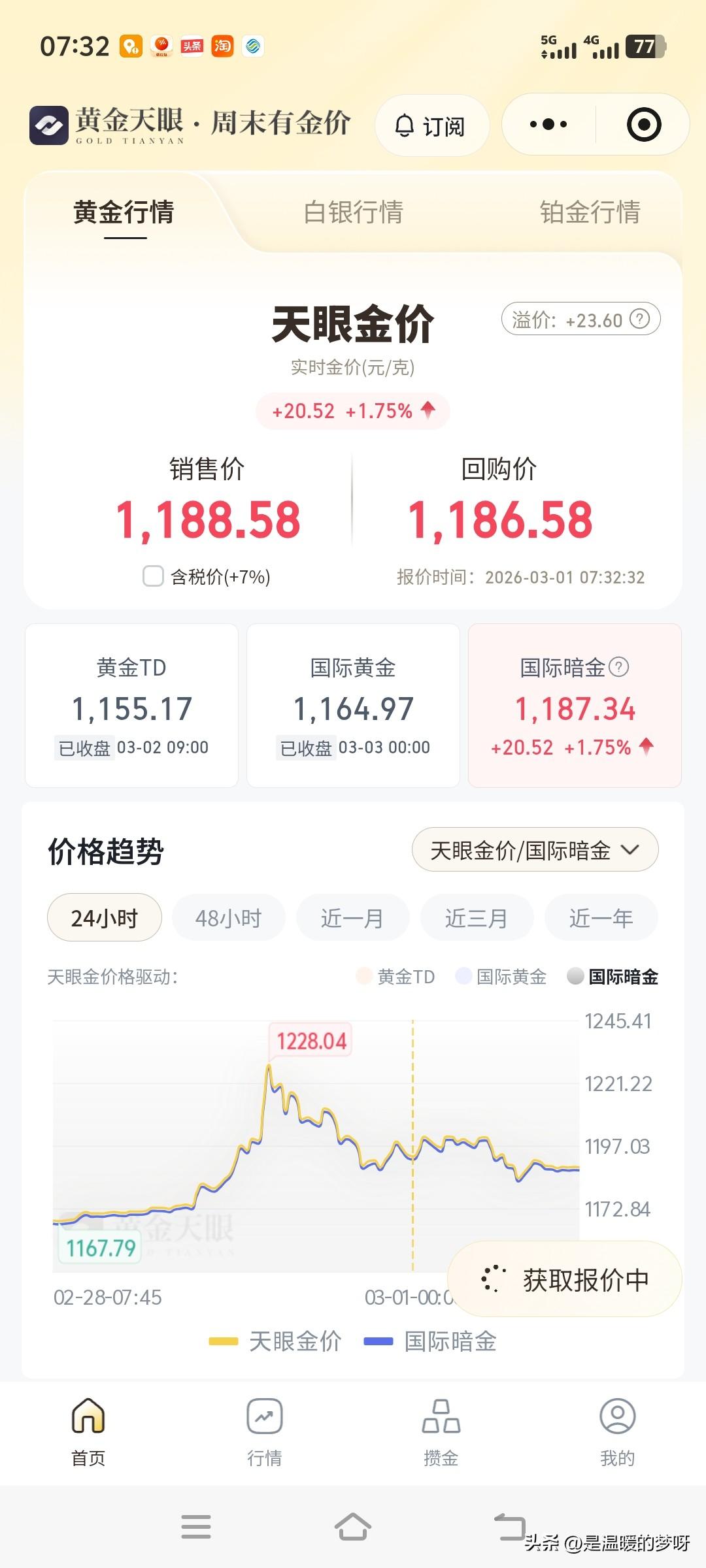 美国以色列打伊朗 大家都认为黄金是世界最通用的避险工具 全网都在吵着黄金又要继续大涨了 不出所料,昨天晚一度冲高至1200元/克,今早回落1188元/克 抄黄金的又要笑麻了 其实冷静思考下来 我觉得全网最值得推荐关于黄金论的博主 一定是北京茗姐 她在黄金400多元/克的时候 就提倡大家多攒黄金多攒钱 她一直推荐的大家是攒金,而不是炒金 这个理论可以说是特别的靠谱 非常适合普通老百姓 不是一味的投机 而是根据自己的能力每个月定投去攒金 即平摊了风险,又让我们不以黄金的跌张而悲喜 我们不但要攒金,更要攒钱 2026 少花钱,多攒钱 我们一起努力吧!