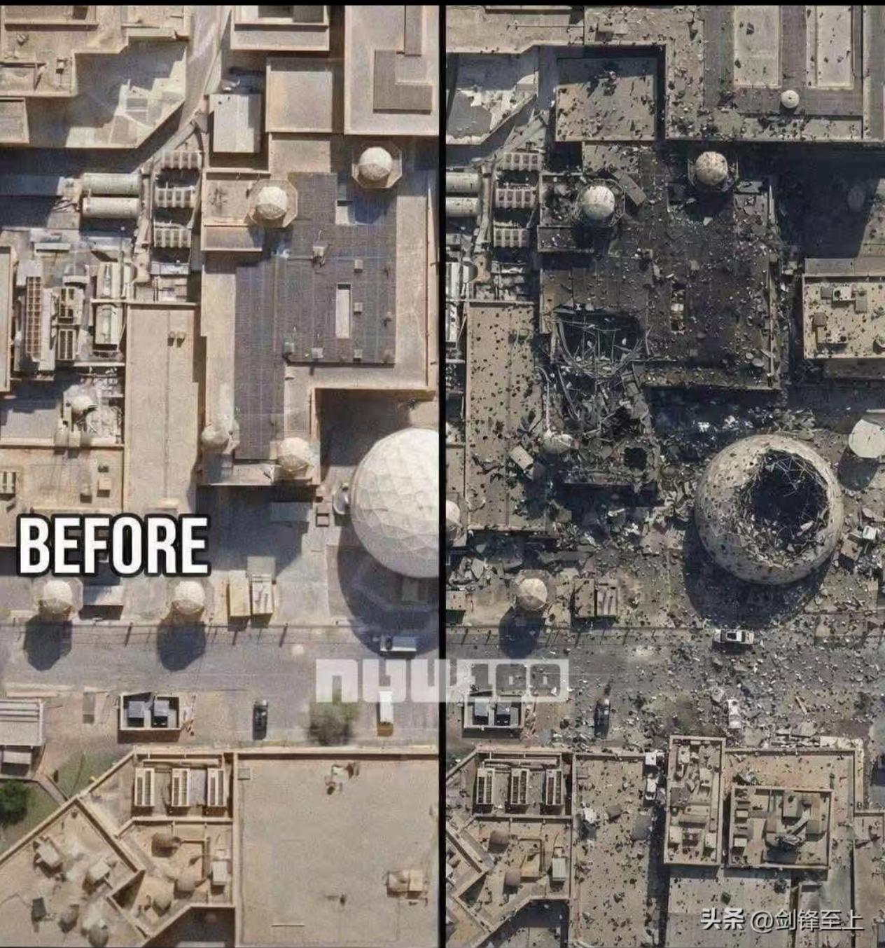 网友发卡塔尔美军雷达站对比照,伊朗的打击,美军不可能毫发无损。 卡塔尔的美军先进雷达被摧毁前后卫星照片对比,伊朗导弹直接命中主雷达罩,直接把整座雷达炸个透心凉!
