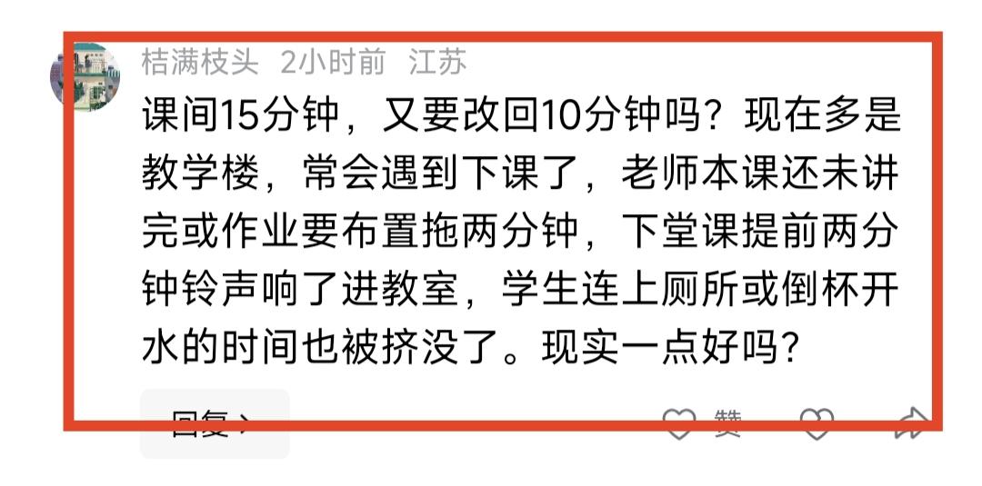 今年开学第一天,打造健康学校成为焦点,其中包括课间十分钟不能把孩子“锁”在教室里,要让孩子走上操场运动。不少网友留言,自己孩子老师喜欢拖堂,上节课老师拖堂几分钟,下一节课老师催着孩子进教室,不要说去操场运动,上厕所都够呛。 今天专门说说“拖堂”这件事情。老师拖堂真的是一个非常非常不好的习惯,课间就那么十分钟,你还拖上三四分钟,别的不说,其实这几分钟真的没有什么效果,大部分时候是老师自作多情罢了。多年前我甚至跟一个老师聊过拖堂这个事情,她说每节课拖两三分钟,一周就多出半个小时,一学期就多出好多节课。我说你这个计算太可怕了,如果每个老师都这样计算的话,那课间十分钟就彻底烟消云散了。 教书这么多年我有个最大的优点,就是绝不拖堂准点下课,其实之所以这么坚决,也是因为自己当年读书的感受。我们那个年代下课之后是要去饭堂打饭,如果最后一节课老师拖堂,心里那个难受劲,到现在还有留存。而准点下课的老师,总会更受欢迎一些。我觉得拖堂并不意味着老师负责任或者勤奋,这是两个概念。 最最关键是拖堂,真的没什么效果,也没什么必要。所以下课五分钟之前就要根据时间调整上课的节奏,坚决不拖堂。 最后还要说一句,老师拖堂不是学生靠近十分钟不去操场的根本原因,因为只有极少数老师拖堂。根本原因是安全问题,怕学生出事故。还有一个原因就是路途遥远,从教室到操场,来回时间不够。教育
