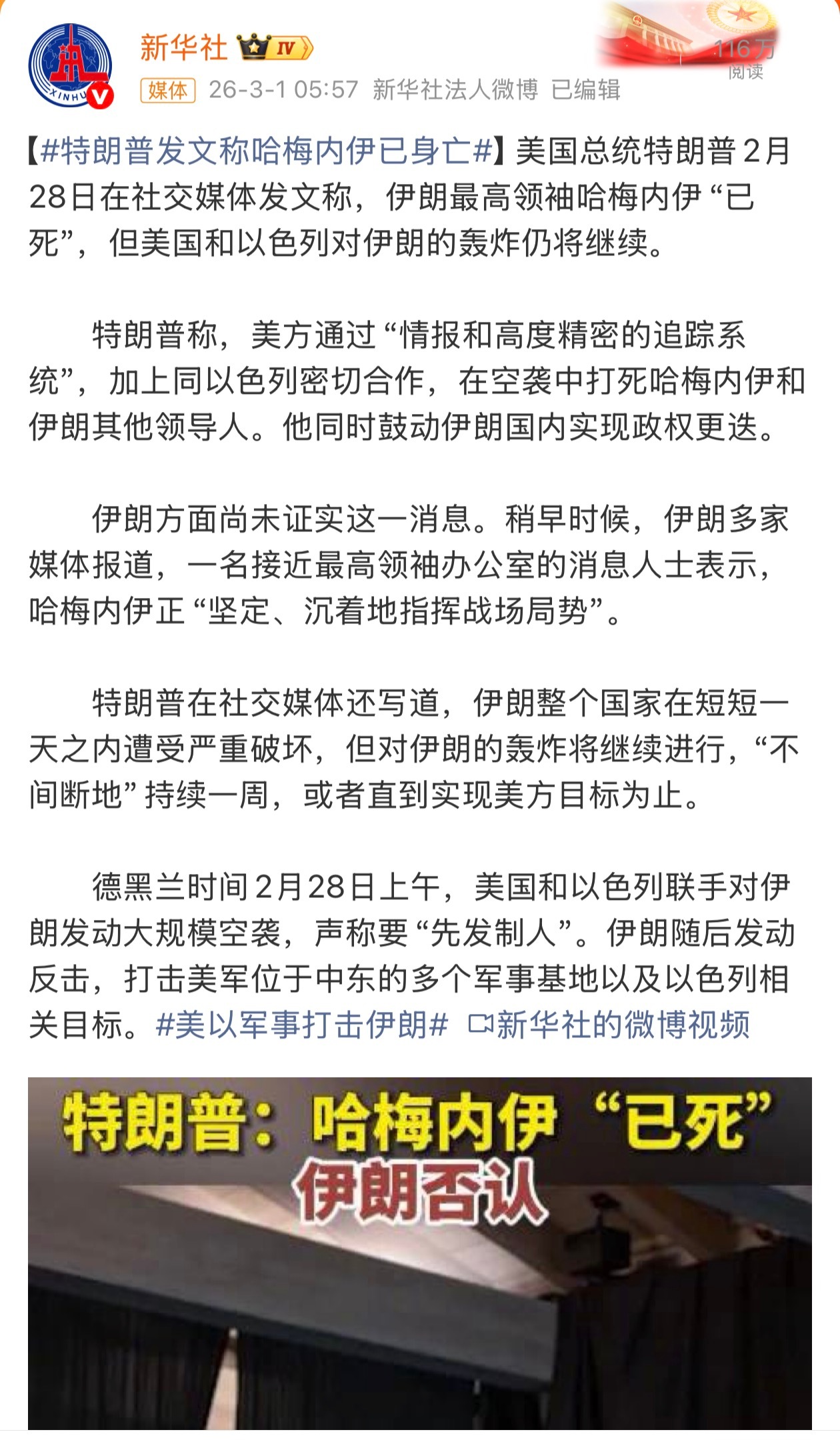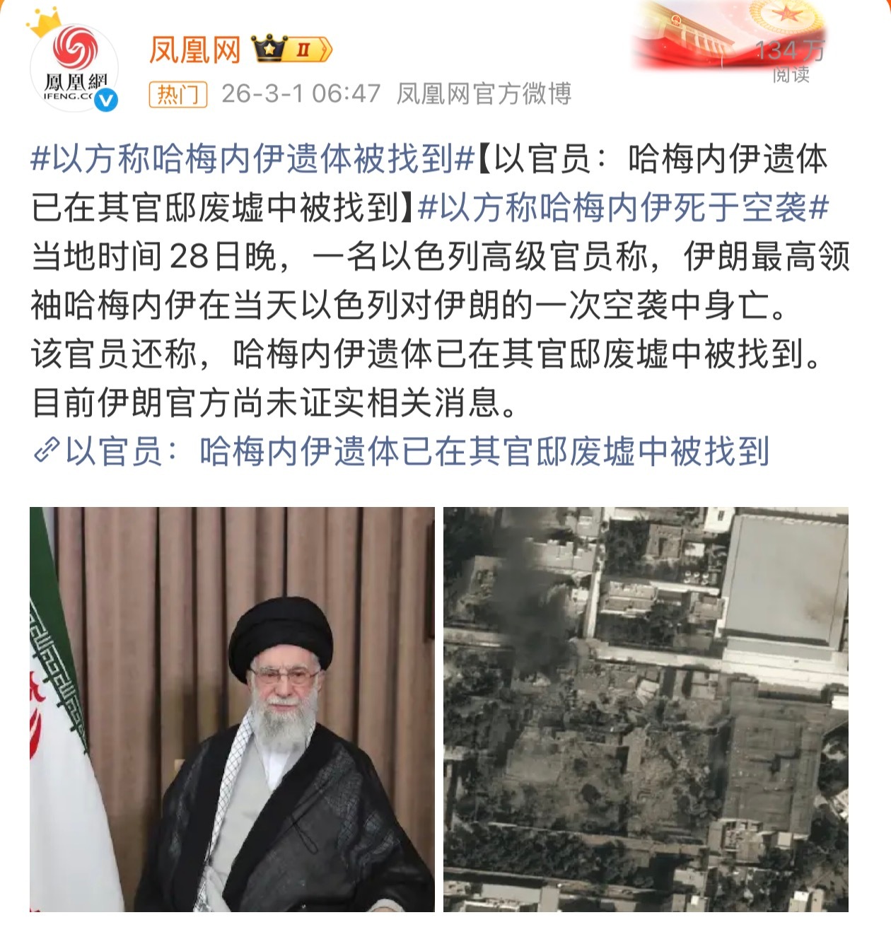 特朗普称哈梅内伊已死 死了?以方称哈梅内伊遗体被找到真的死了?哈梅内伊将发表公开讲话到底死没死?哎……还是那句话,愿世界和平吧!