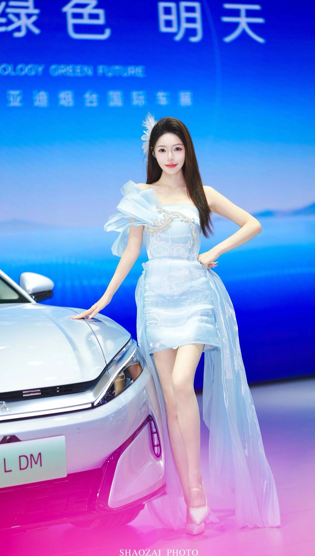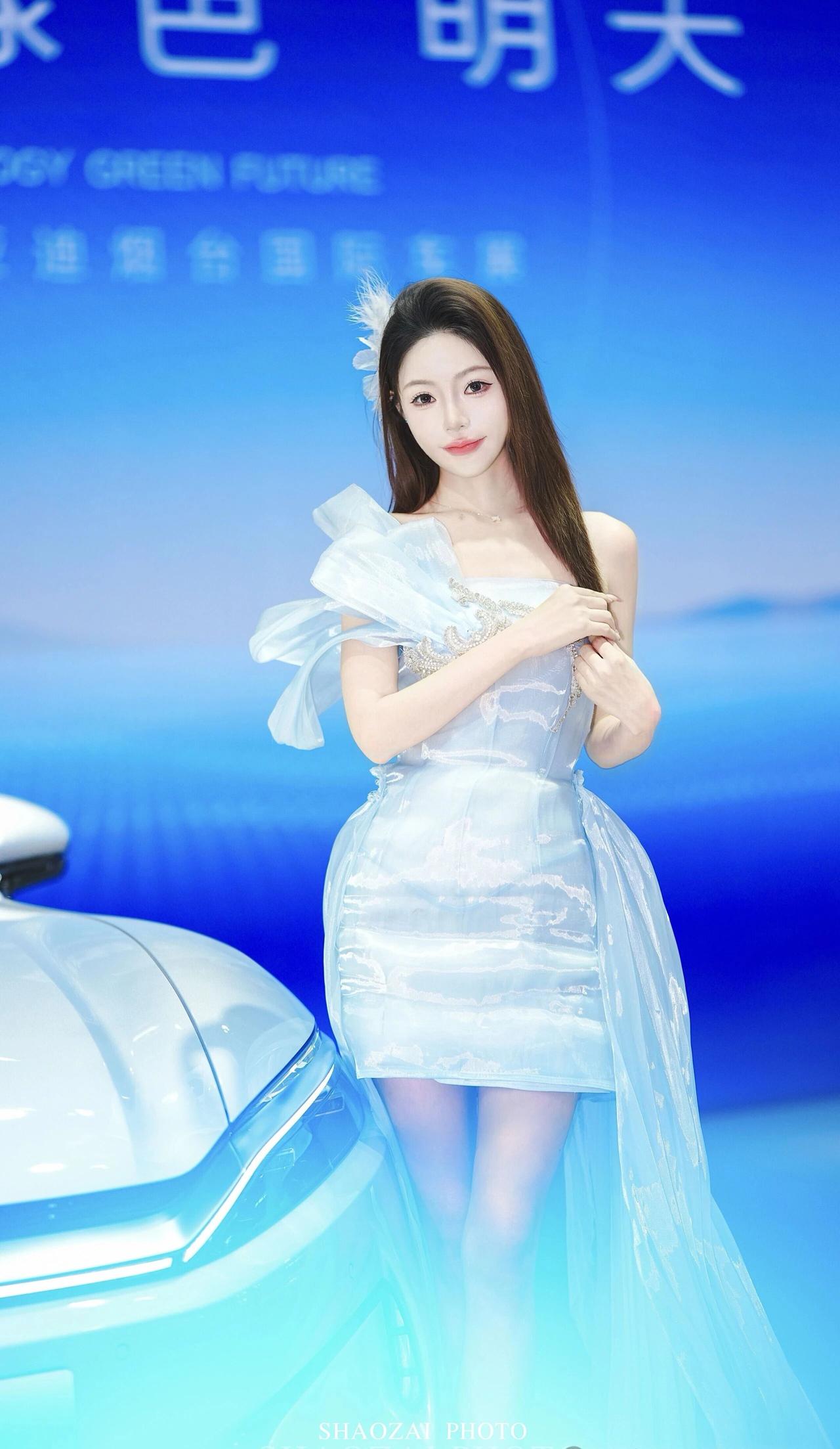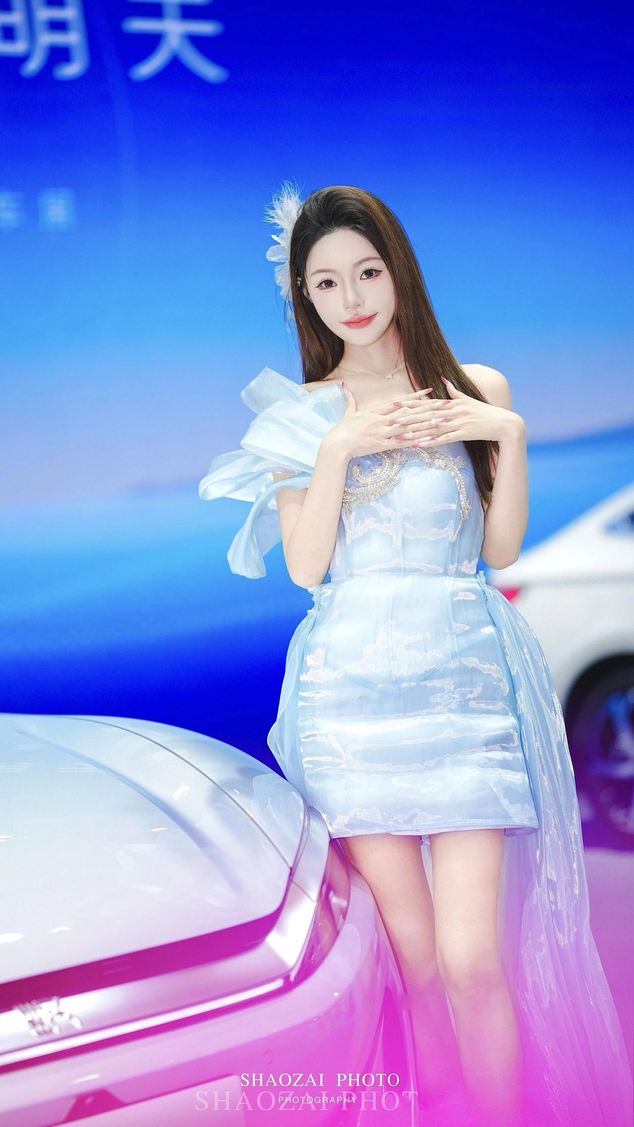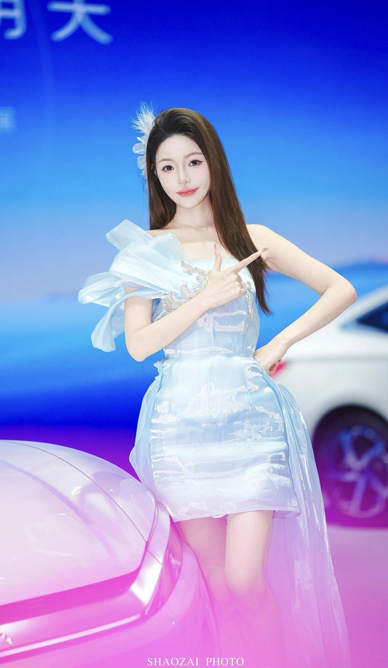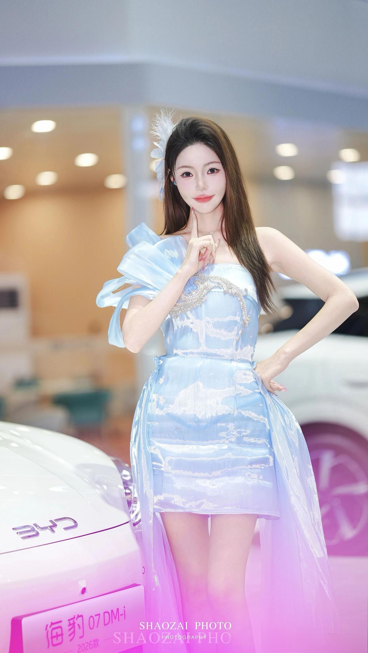 裙装是单肩设计,一侧大荷叶纱袖轻盈蓬松,胸口缀有精致水钻装饰,短款裙身搭配飘逸拖尾,流光质感高级又灵动。 她长发垂顺,侧边点缀白色羽毛发饰,妆容清透精致,五官柔美。 倚靠在比亚迪展车旁,姿势优雅多变,在蓝紫渐变灯光下,宛如车展上的清冷仙子,柔美又夺目。
