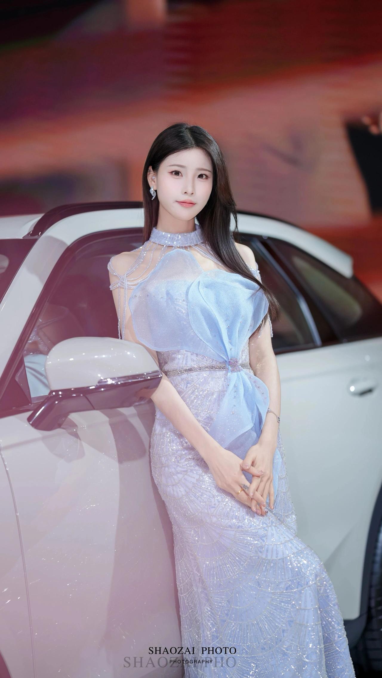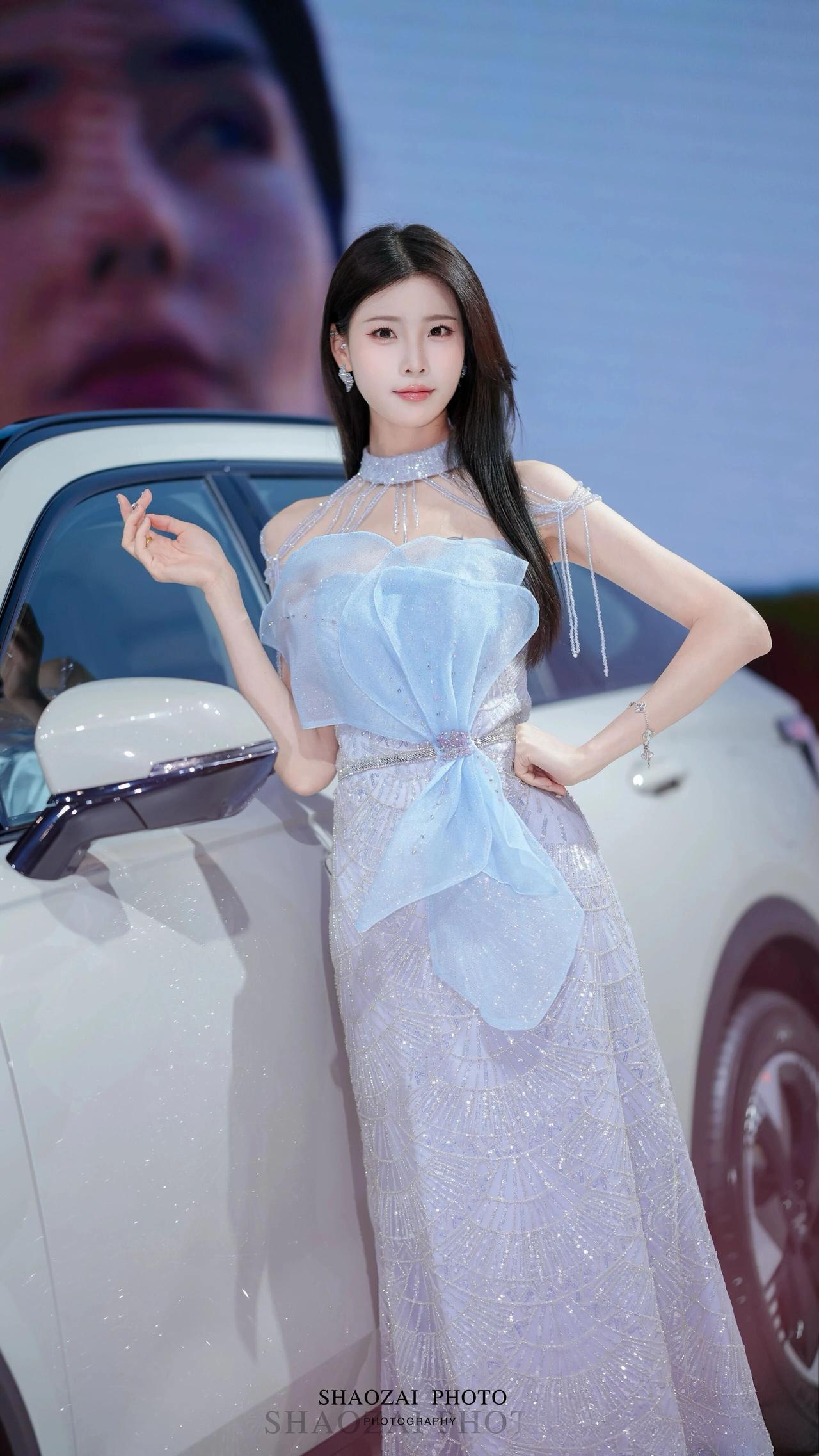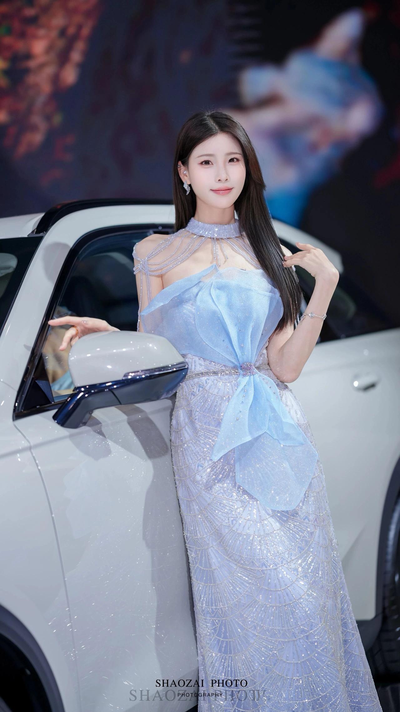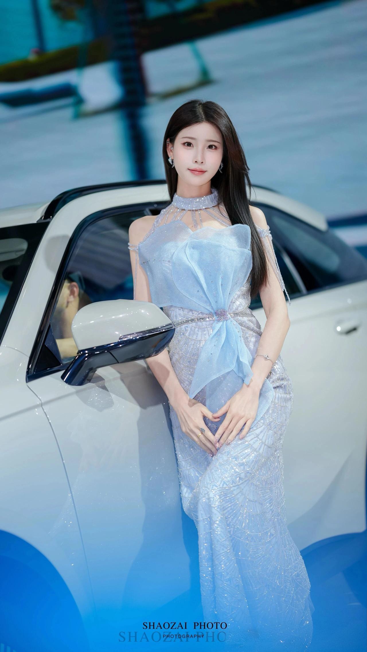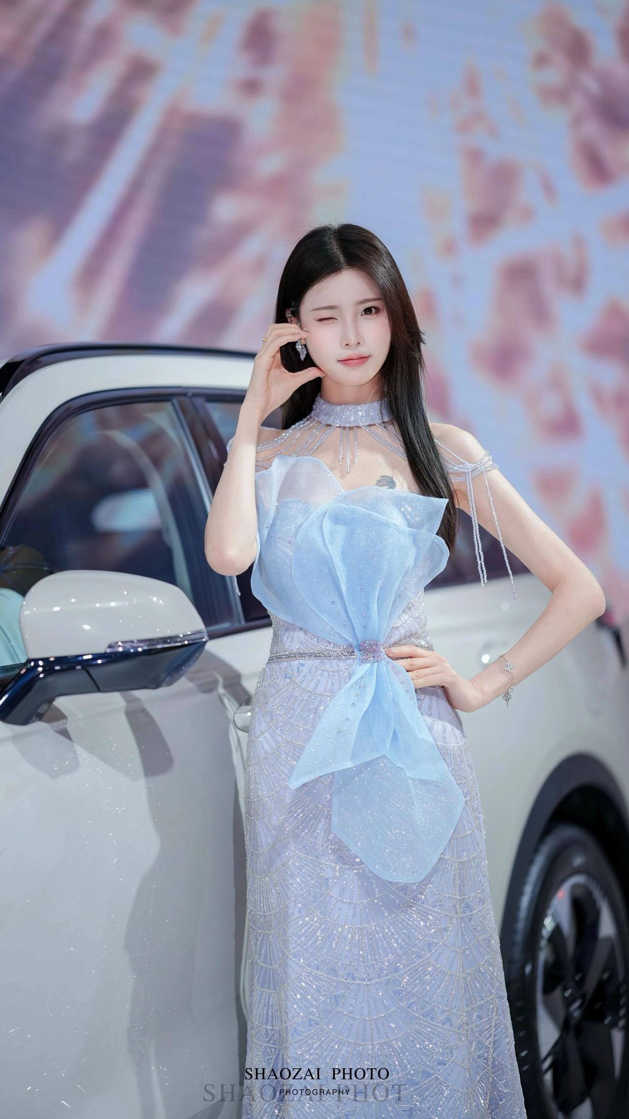 身姿纤秾合度,长发垂顺柔润,眉眼清透温婉,时而优雅倚车、时而灵动比心,自带温柔氛围感。蓝纱与亮白车身相映,一颦一笑都尽显温婉精致,是车展里温柔又耀眼的存在。